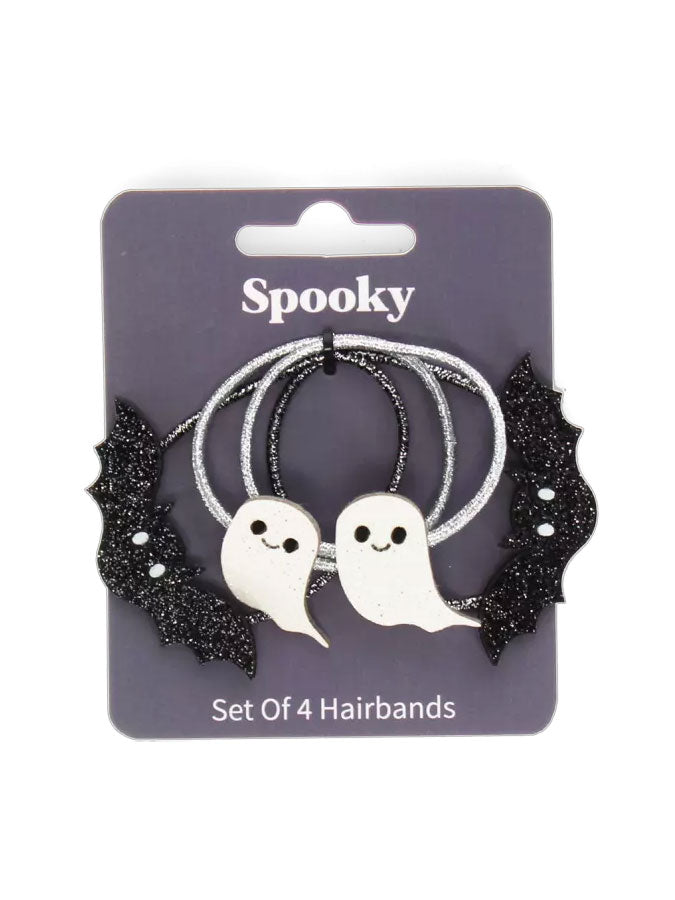 Add a touch of Halloween fun to your look with Set of 4 Glitter Hair Bands Spooky from Rex. These hair bands showcase ghost and bat designs, perfect for Halloween costumes or as a playful addition to any outfit, no matter your age! A charming gift for those who adore all things supernatural.