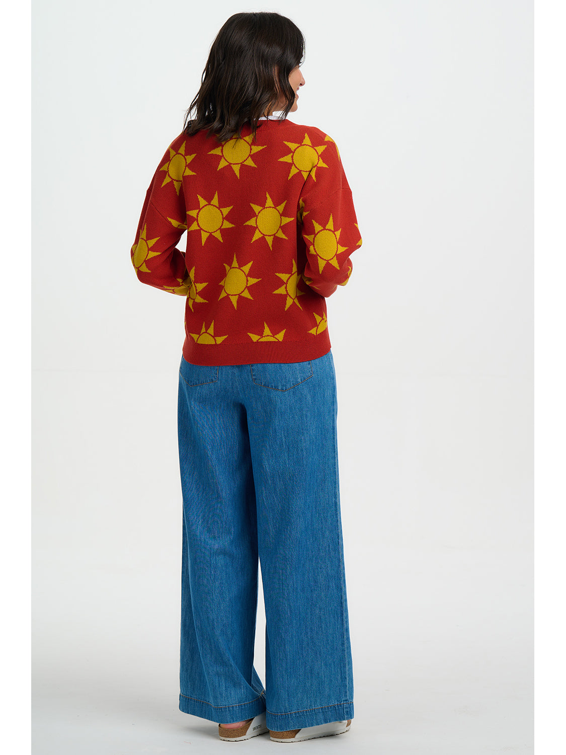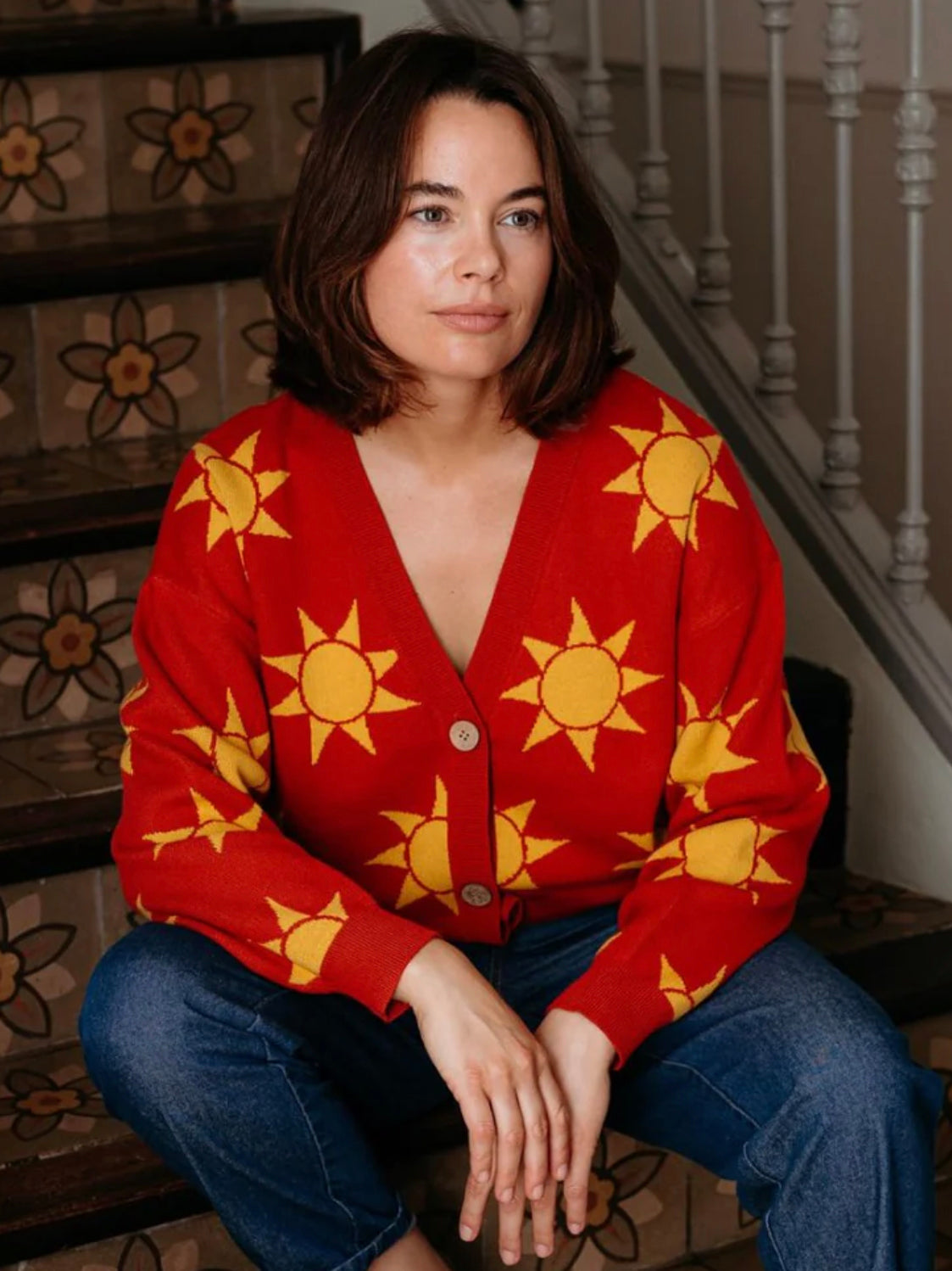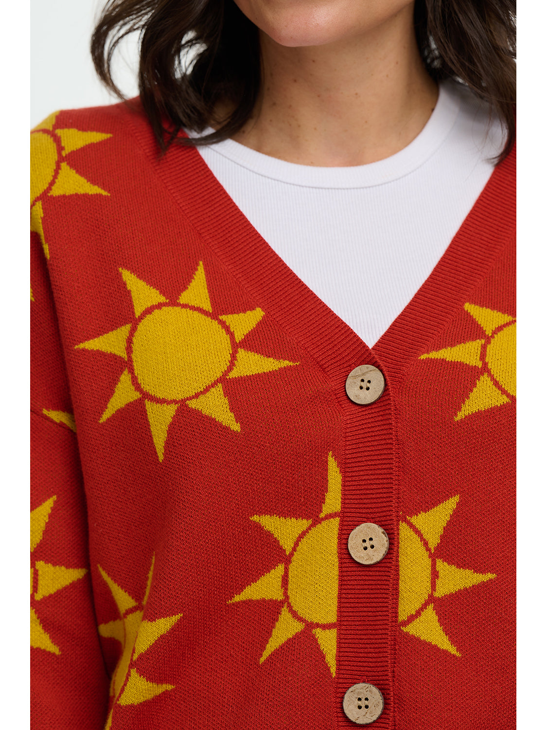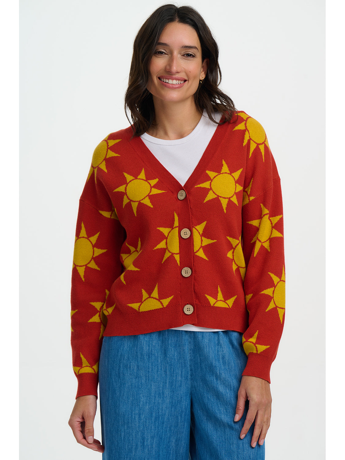 The Angelica V-Neck Cardigan from Sugarhill Brighton is a joyful cotton knit designed to brighten everyday outfits. Crafted from soft, breathable cotton, this standout cardigan features an all-over Canyon Sunshine motif in warm yellow set against a rich rusty red base for a playful, retro-inspired feel. The relaxed fit, classic V-neckline and button-through front make it perfect for easy layering over tees and dresses.