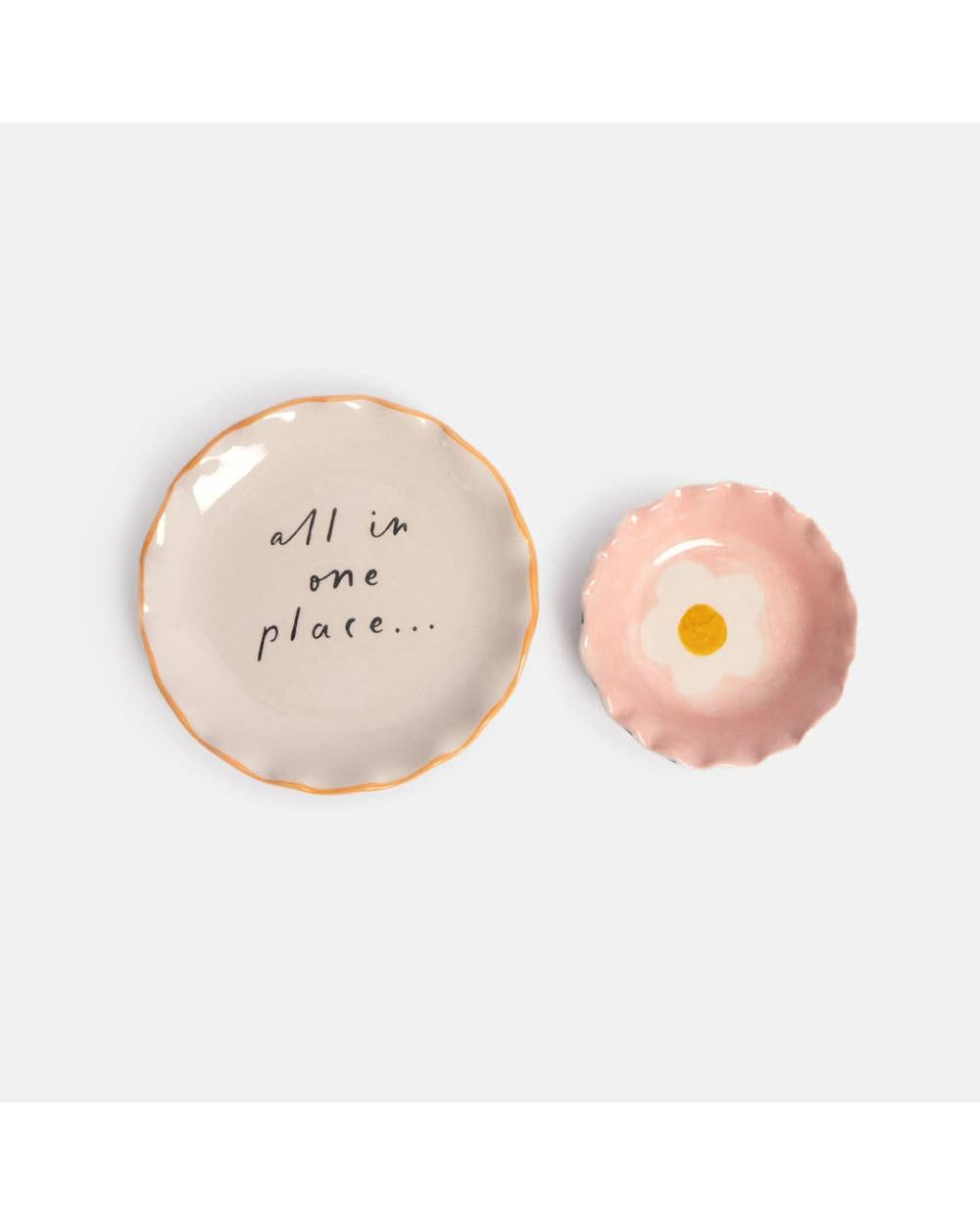 Add a playful yet elegant touch to your space with this set of two decorative trinket bowls. Featuring one bowl with the message “All in one place…” and another with a pastel flower design, they’re perfect for storing small treasures or adding a whimsical accent. Crafted from ceramic stoneware, this charming set makes a thoughtful gift or a treat for yourself.