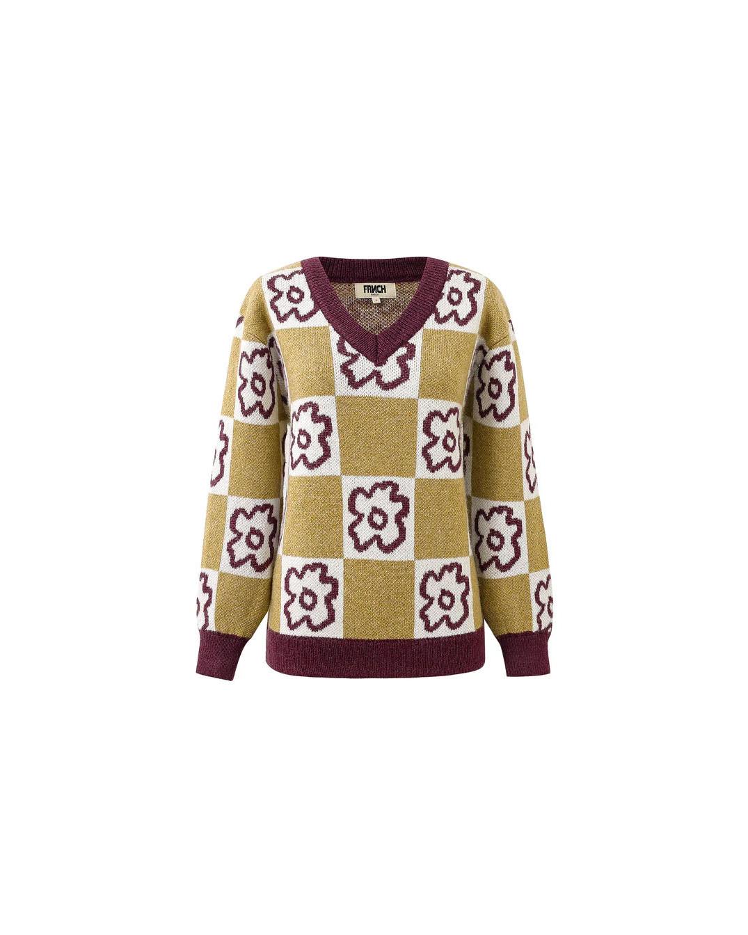 The Primevere camel sweater combines a delicate floral checkered pattern with a straight, wide cut for a relaxed yet polished fit. Its V-neck design complements the soft mesh fabric, ensuring breathability and comfort. Highlighted by contrasting collar and cuffs, this sweater offers a sophisticated touch, ideal for layering or wearing on its own with a refined edge.
