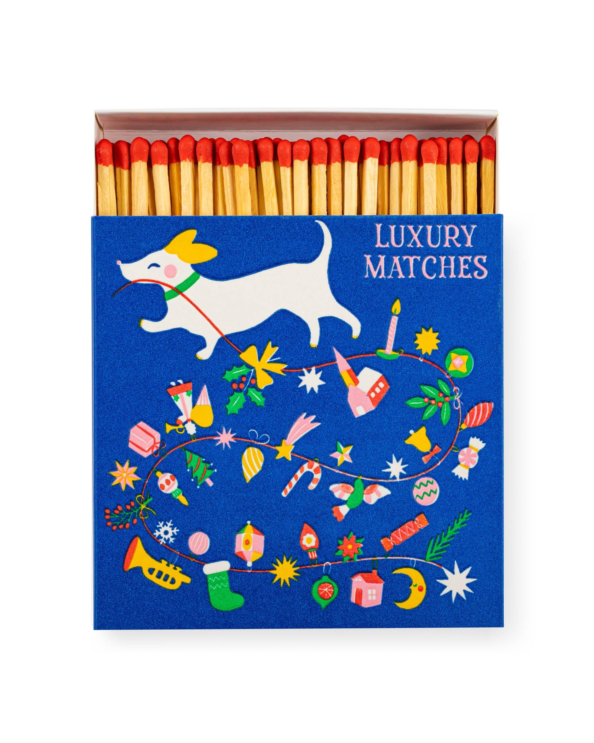 Our signature square matchbox featuring a dog running around with a Christmas garland filled with festive decorations in it's mouth.
