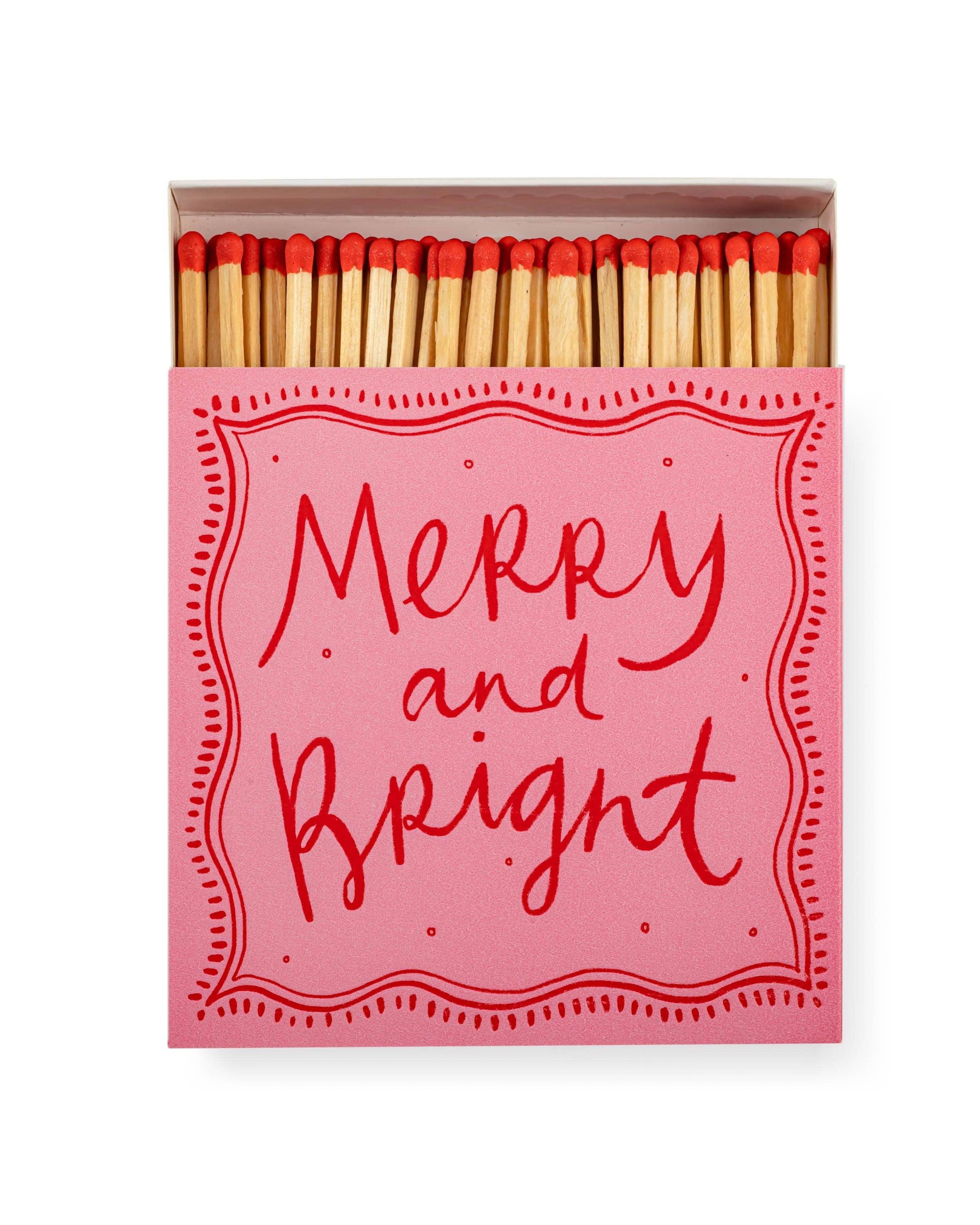 Our signature sqauare matchbox featuring a bold pink background with the words 'Merry and Bright' in a red handwritten font and a red detail boarder.