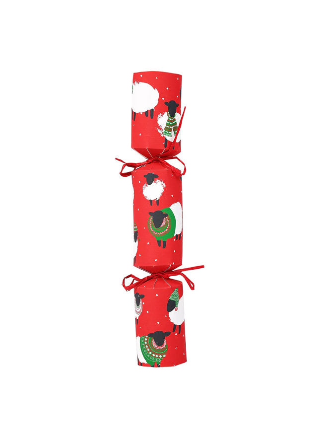 The Talking Tables Sheep Crackers are a pack of 6 festive crackers designed with paper sourced from FSC-certified forests. The crackers feature cute fluffy animals wearing Aran knit jumpers and fuzzy hats against a cheerful red background. Inside each cracker, you'll find a fun bingo game and a paper crown for some festive Christmas fun around the table.