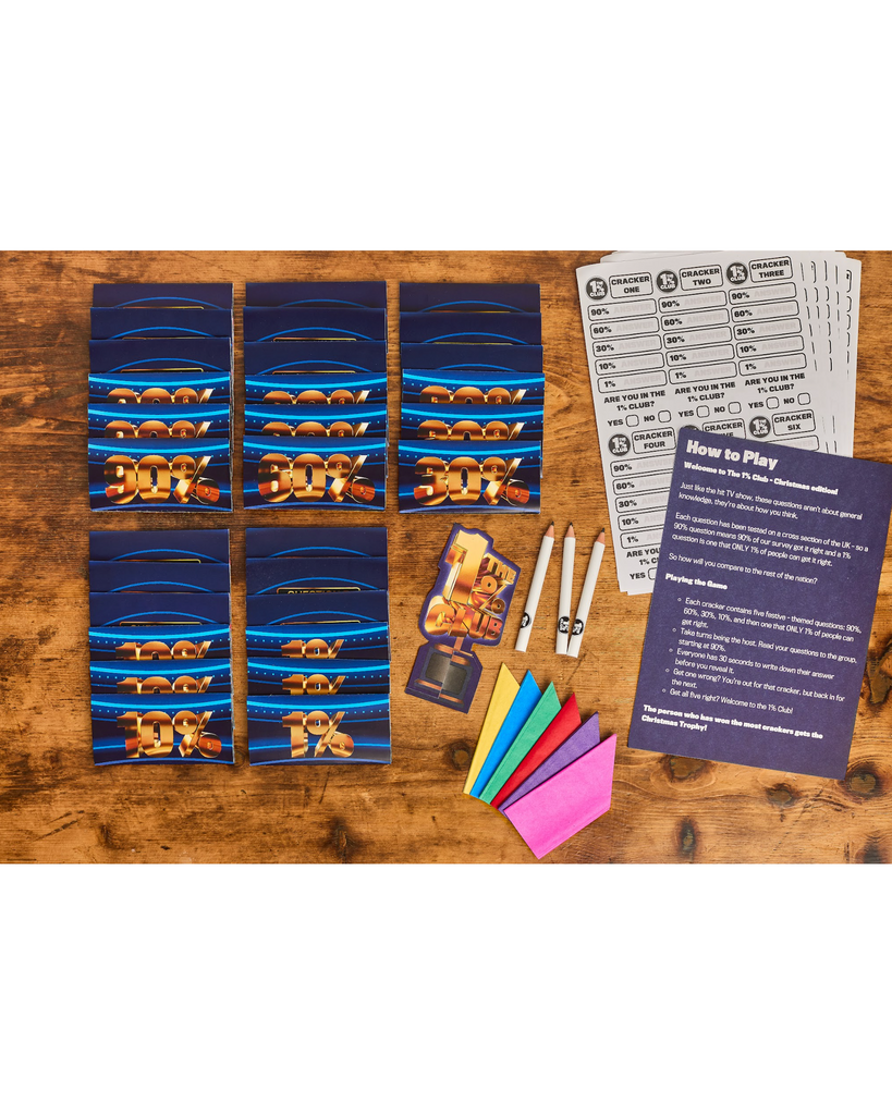 Each cracker contains a hat, 1% Club pencil and 5 questions, starting with one 90% of people can answer and getting harder until you reach the 1% question. Find out who among you has what it takes to join the 1% club.