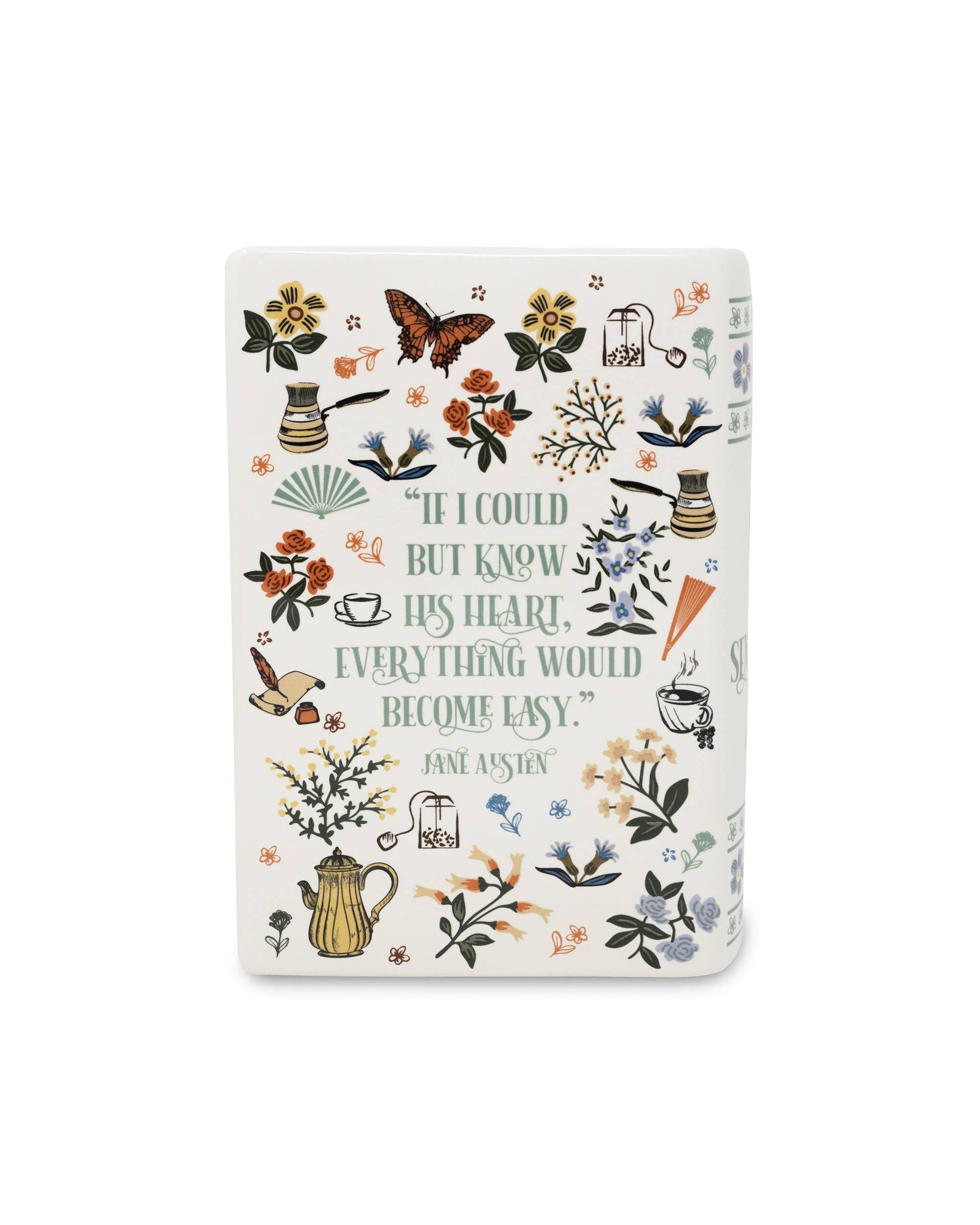 Our large ceramic book vase is the perfect piece for any book lover's space. Designed to mimic a hardcover book, the vase features sculpted pages, with a wide top opening for flowers, desk supplies, utensils, and more. The cover features art inspired by Jane Austen's beloved novel, Sense and Sensibility to adorn your space with bookish charm.
