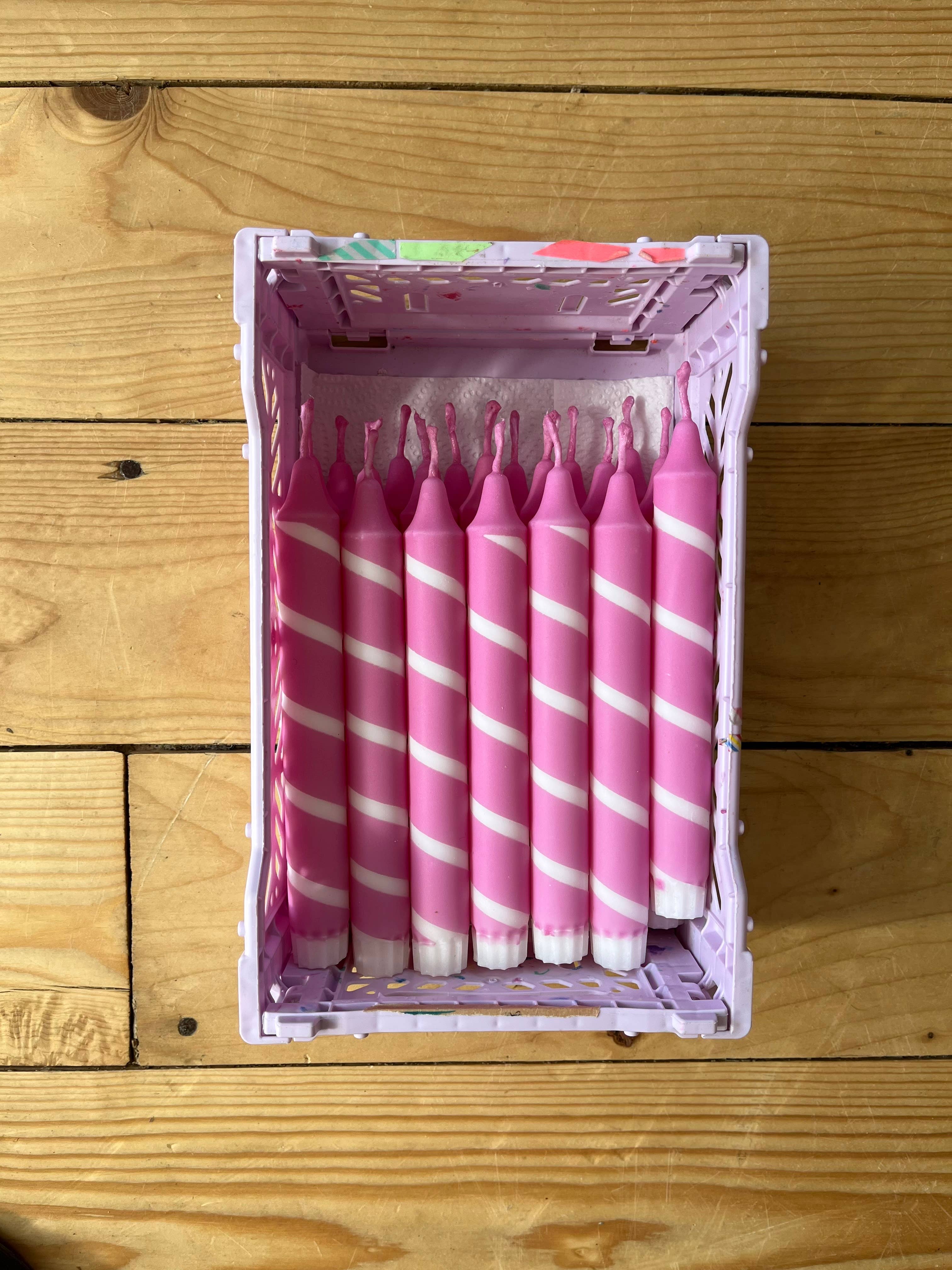 Introducing the Rose & White thin stripe Candle by True North Soapworks - a thinly striped candle featuring a vivid purple with thin white stripes. These quirky candles are hand-crafted in Scotland using 100% Stearin wax, making them longer-lasting and smoke/drip-free. Plus, with a burn time of approximately 6 hours, they're perfect for adding a unique touch to any home.