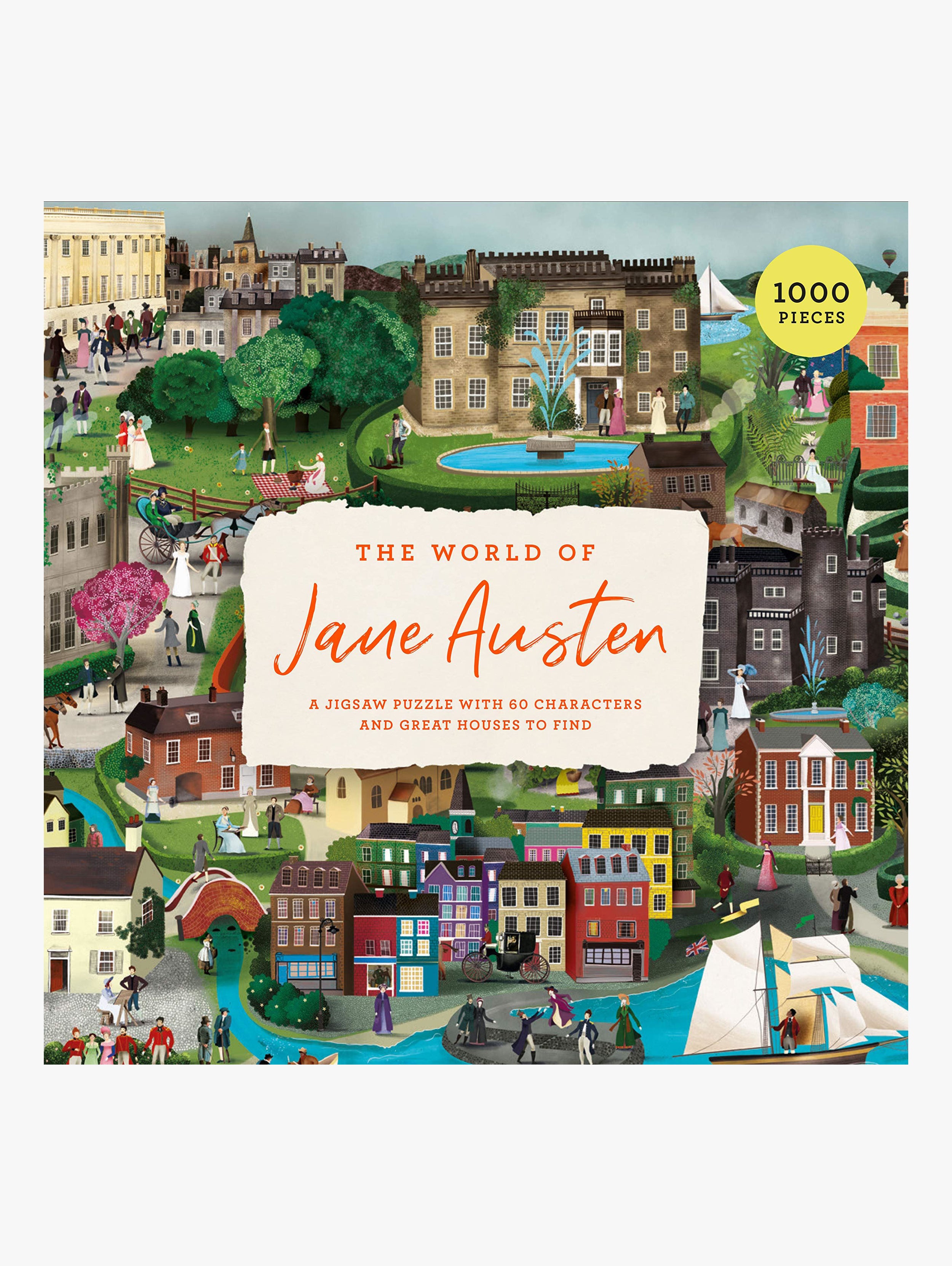 Here we have the World Of Jane Austen 1000 Piece Puzzle from Laurence King. Piece together the world of Jane Austen in this new jigsaw inspired by her life and works. Take a tour of Austen's world from the rolling hills of Derbyshire, via Hampshire and Lyme Regis, to the golden stone of the Bath skyline, and encounter a cast of her characters and contemporaries. From Mr Darcy walking the grounds of Pemberley, to Anne Eliot enjoying a seaside escape, discover hidden gems as you make this puzzle and enjoy the final scene.