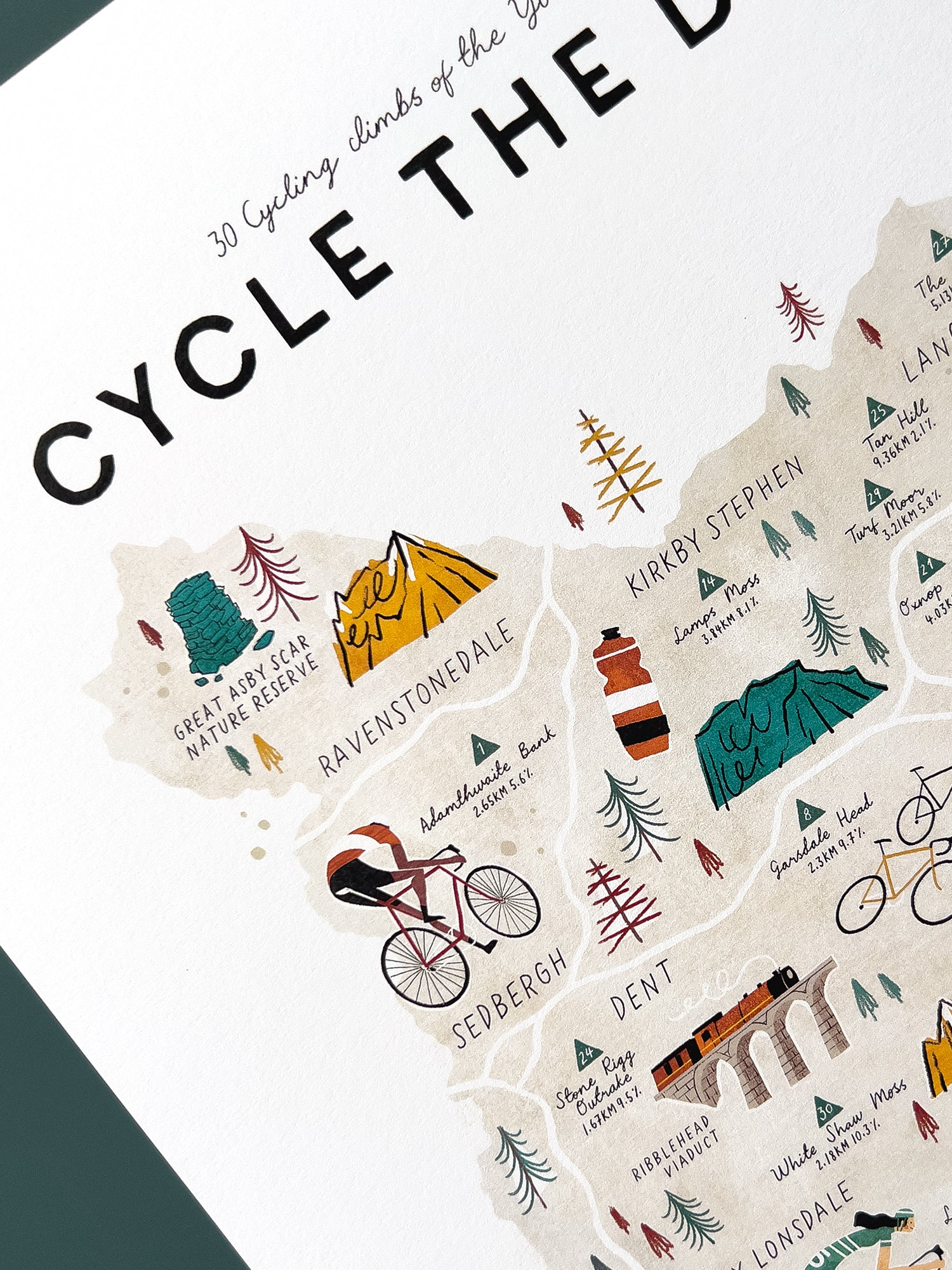 Explore the Yorkshire Dales with this Cycle The Dales Poster With Hanger. Illustrated with 30 cycling climbs, it provides inspiration for where to cycle in the National Park and tracks your accomplishments. A great gift for cyclists or Dales adventurers, the A3 size print comes with an oak finished wooden magnetic poster frame, ready for hanging in your home, office, or camper van.