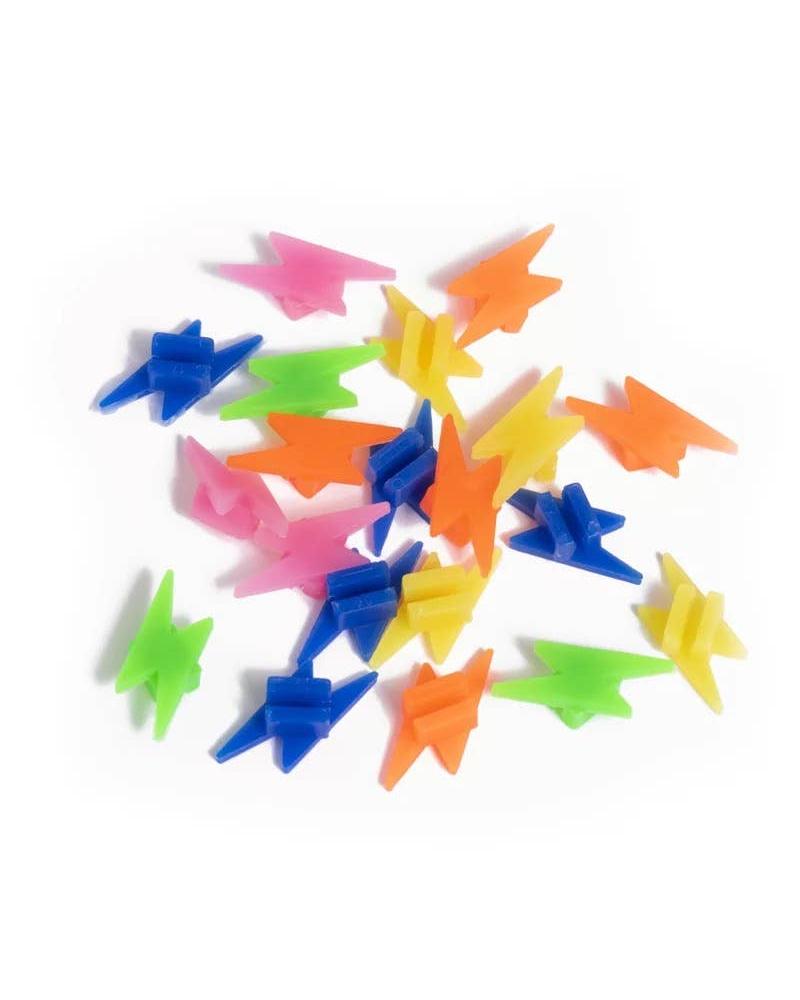 1 bag of 20 multicolored lightning bolts that clip onto the spokes of the bike wheels.