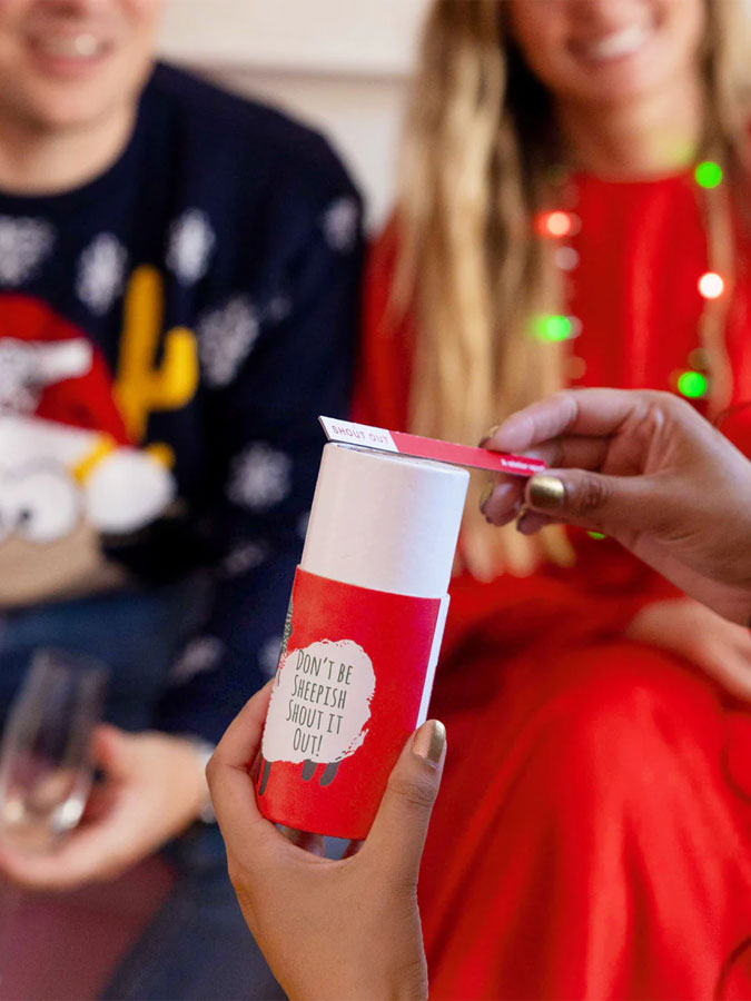 This is the Christmas Sheep Shout Out from Talking Tables. Looking to spark some Christmas rivalry? Let your customers showcase their Christmas trivia knowledge with this shout out game. A festive addition to our best-selling dipsticks games range, simply pull out a game stick and read the Christmas themed trivia question aloud to the other players. You can't be sheepish in this game! The first person to shout out the correct answer wins the stick, the player with the most sticks at the end is crowned the woolly champion.