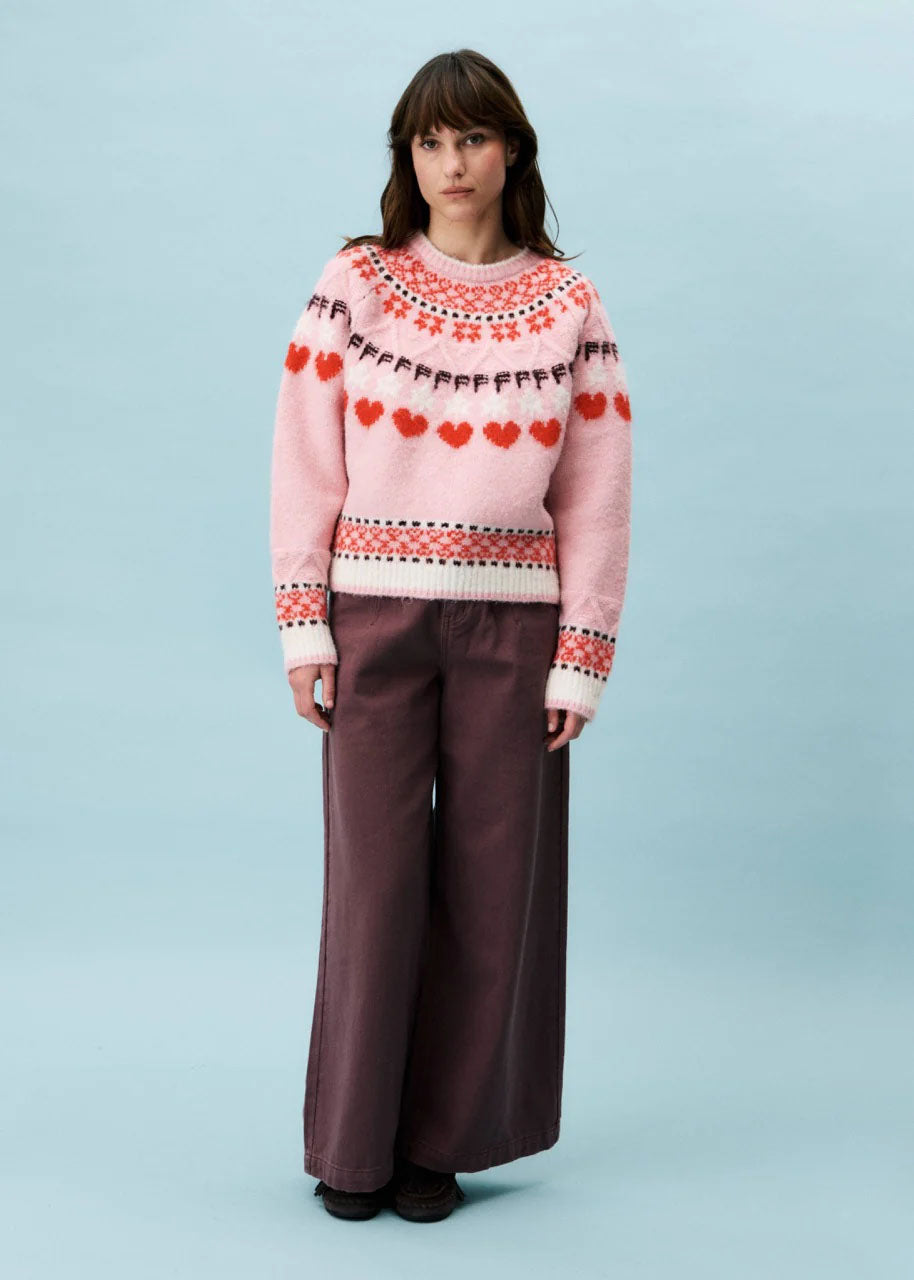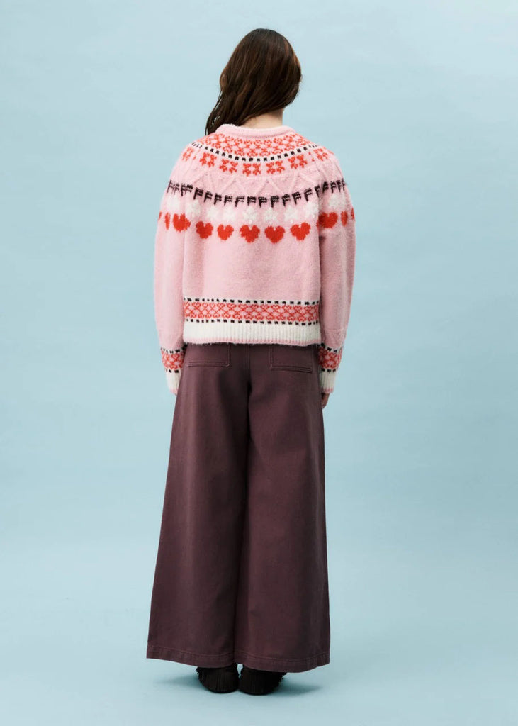 A beautifully knitted jumper in a soft rose shade, featuring a charming mix of red, white, and brown patterns for a playful, cosy look. Designed with a classic round neckline and a standard fit—opt for a size up if you prefer a looser, more laid-back style. Pair it with rich chocolate brown trousers to let the colours really stand out.
