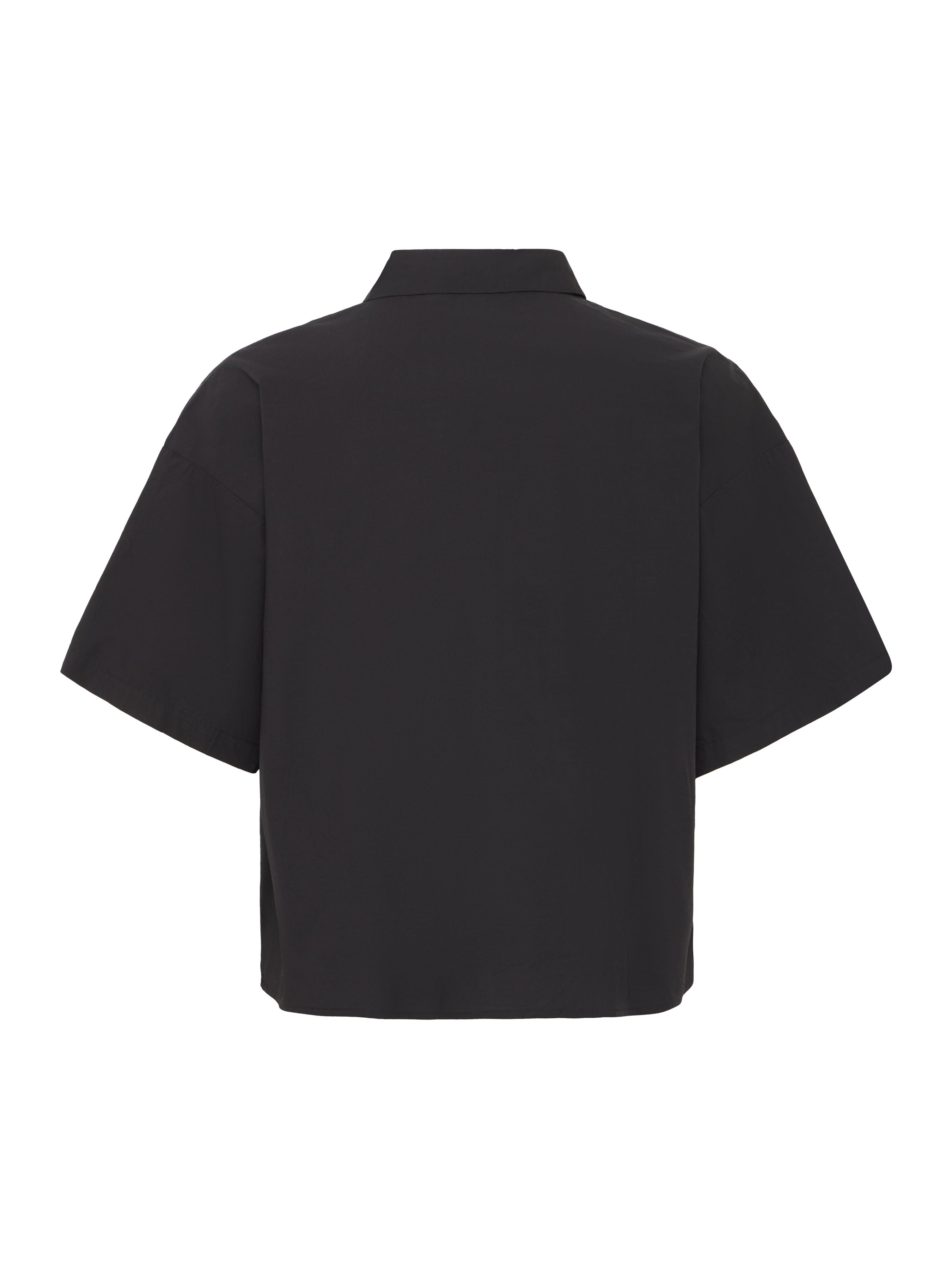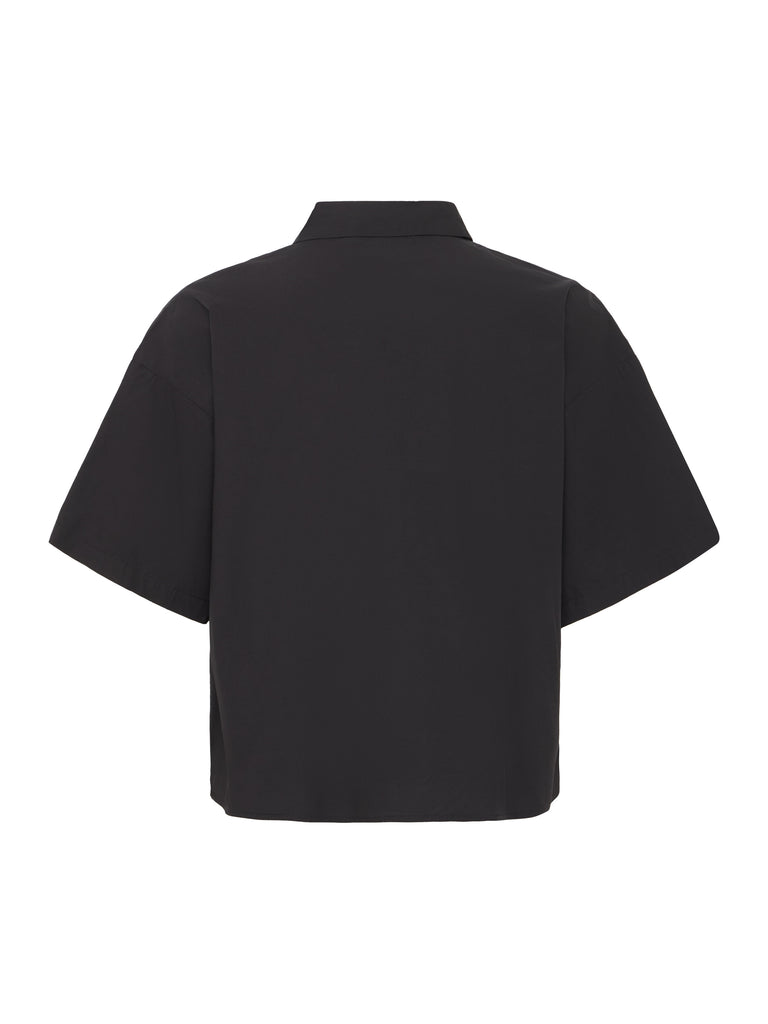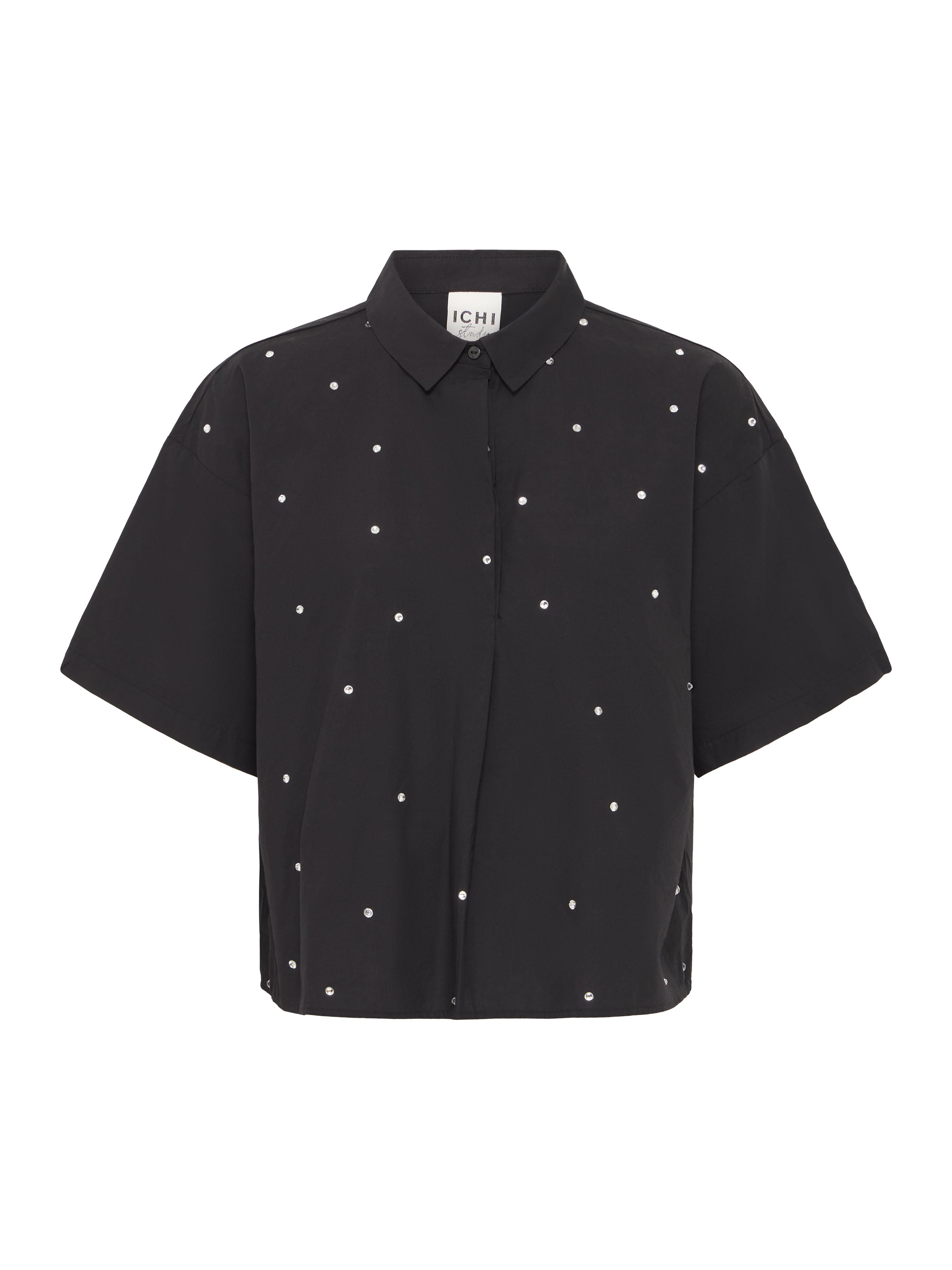 Meet the Lisari Shirt — a chic black short-sleeve style with a touch of sparkle. Designed with a subtle diamante pattern, it pairs a classic collared neckline with a relaxed, boxy fit for effortless wear. Finished with a neat two-button placket, it’s the perfect piece to dress up denim or add a little shine to your everyday looks.