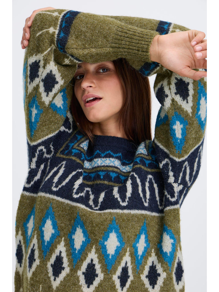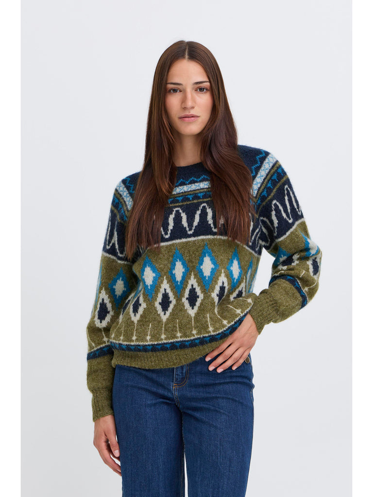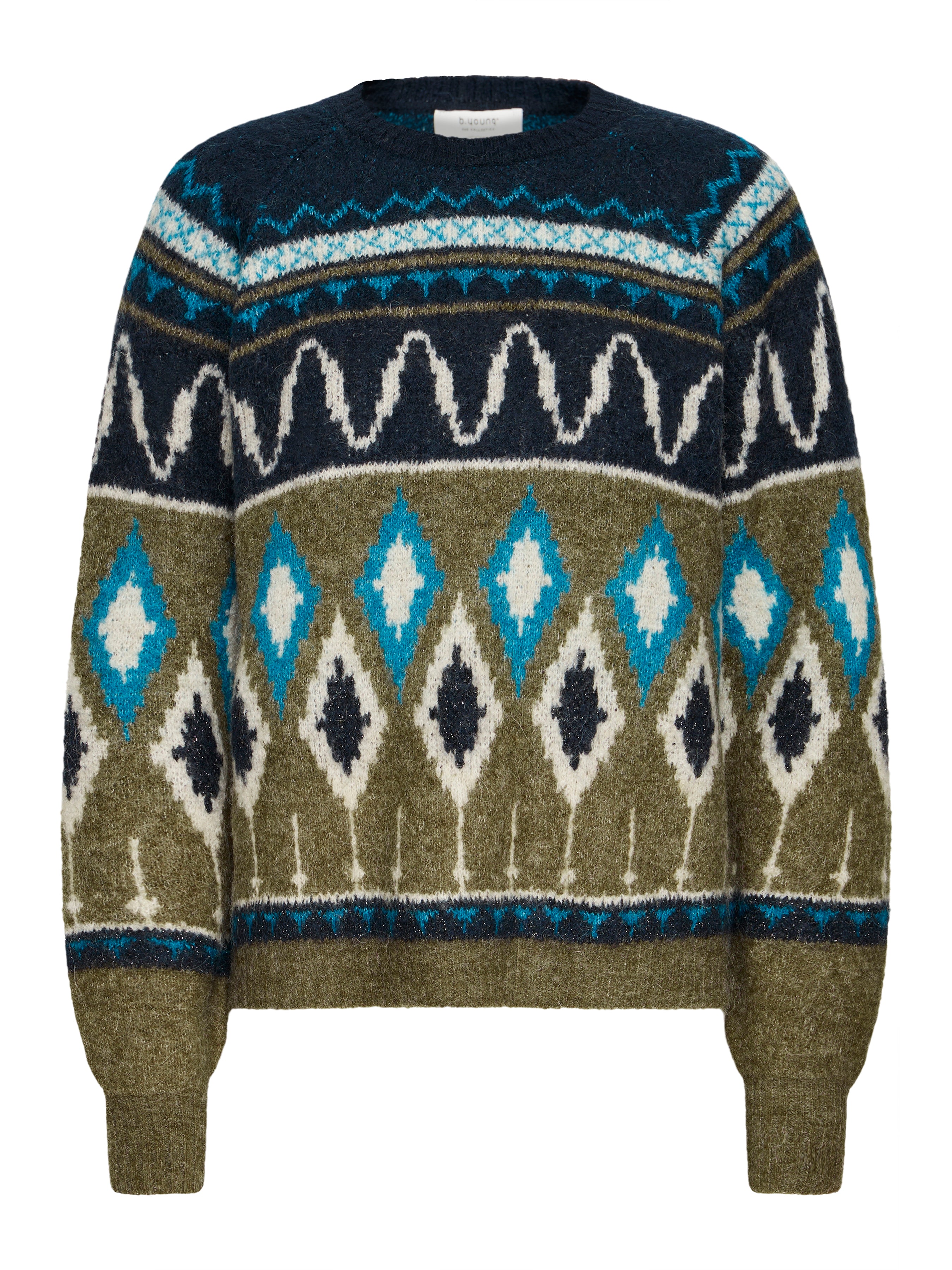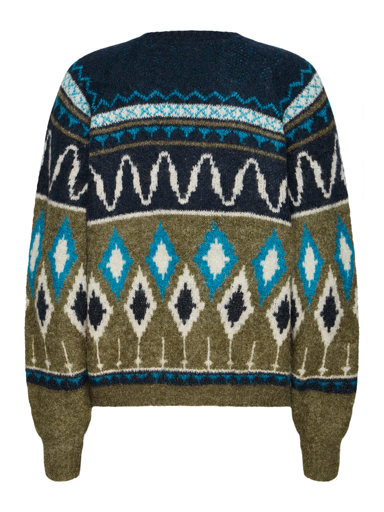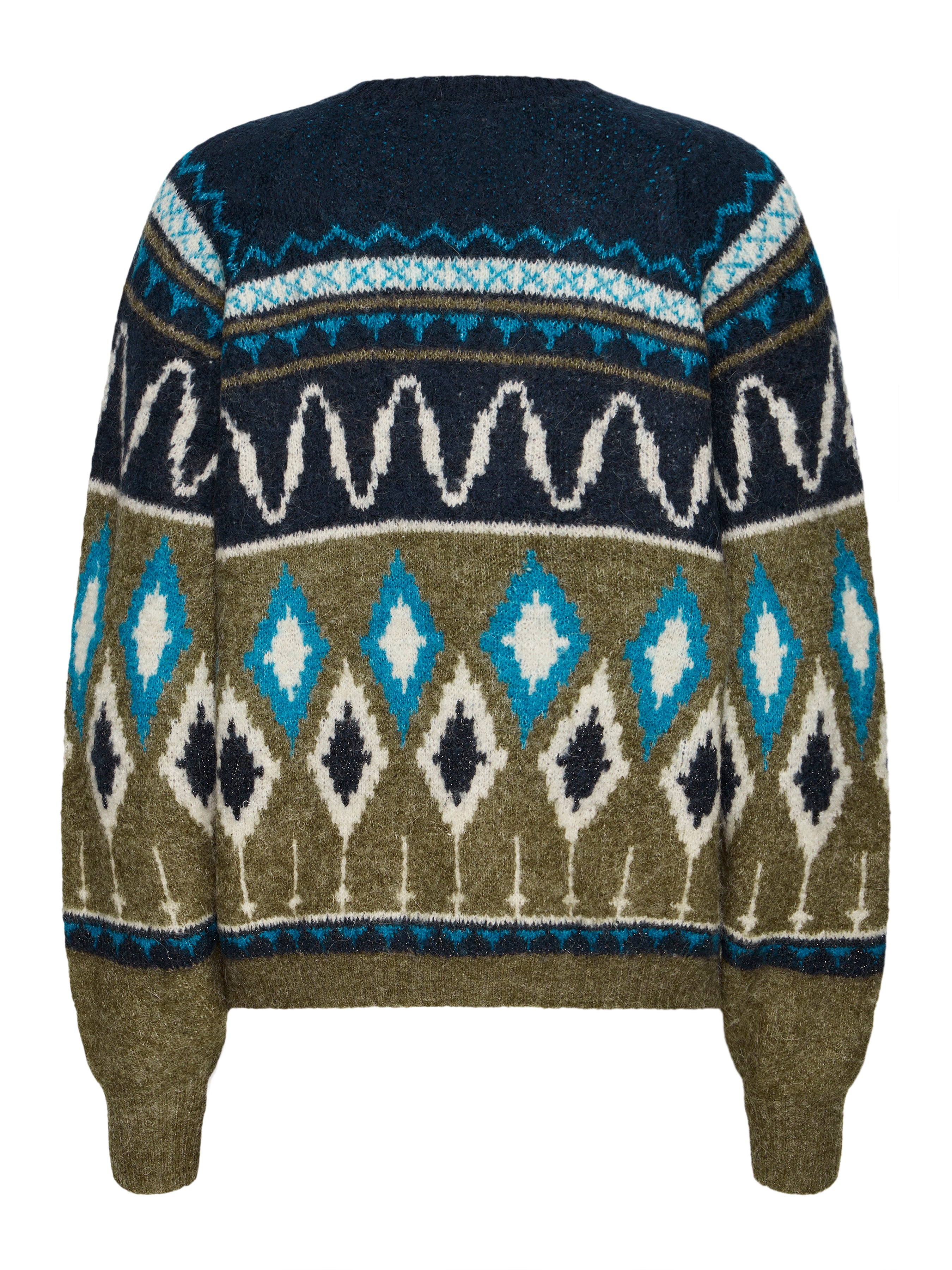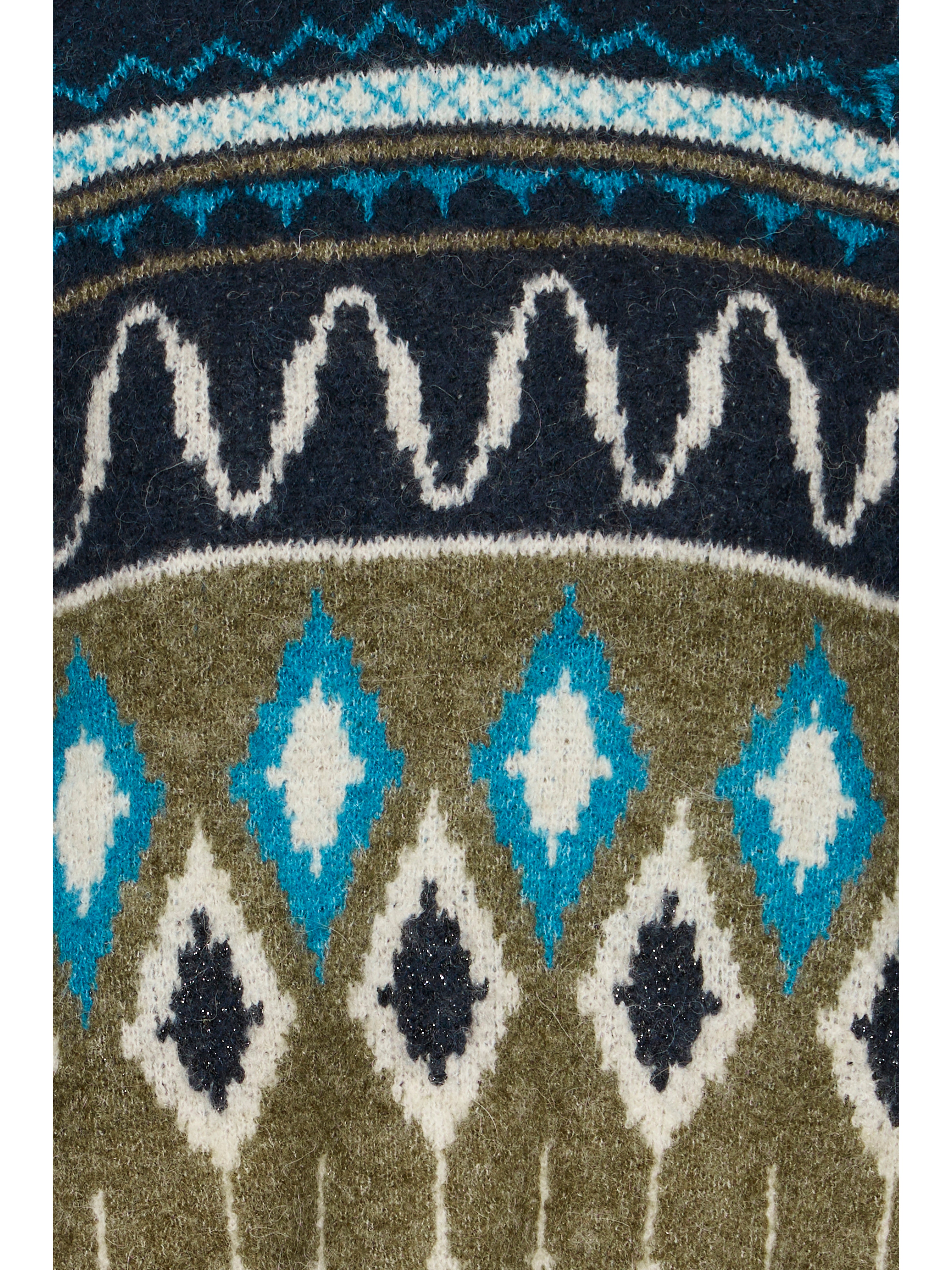 The perfect jumper for chilly days. Featuring a modern jacquardf knit pattern in bold navy, khaki, turquoise, and cream — with just a hint of subtle lurex for a touch of sparkle. Finished with a soft wool blend to keep you warm and cosy all season long.