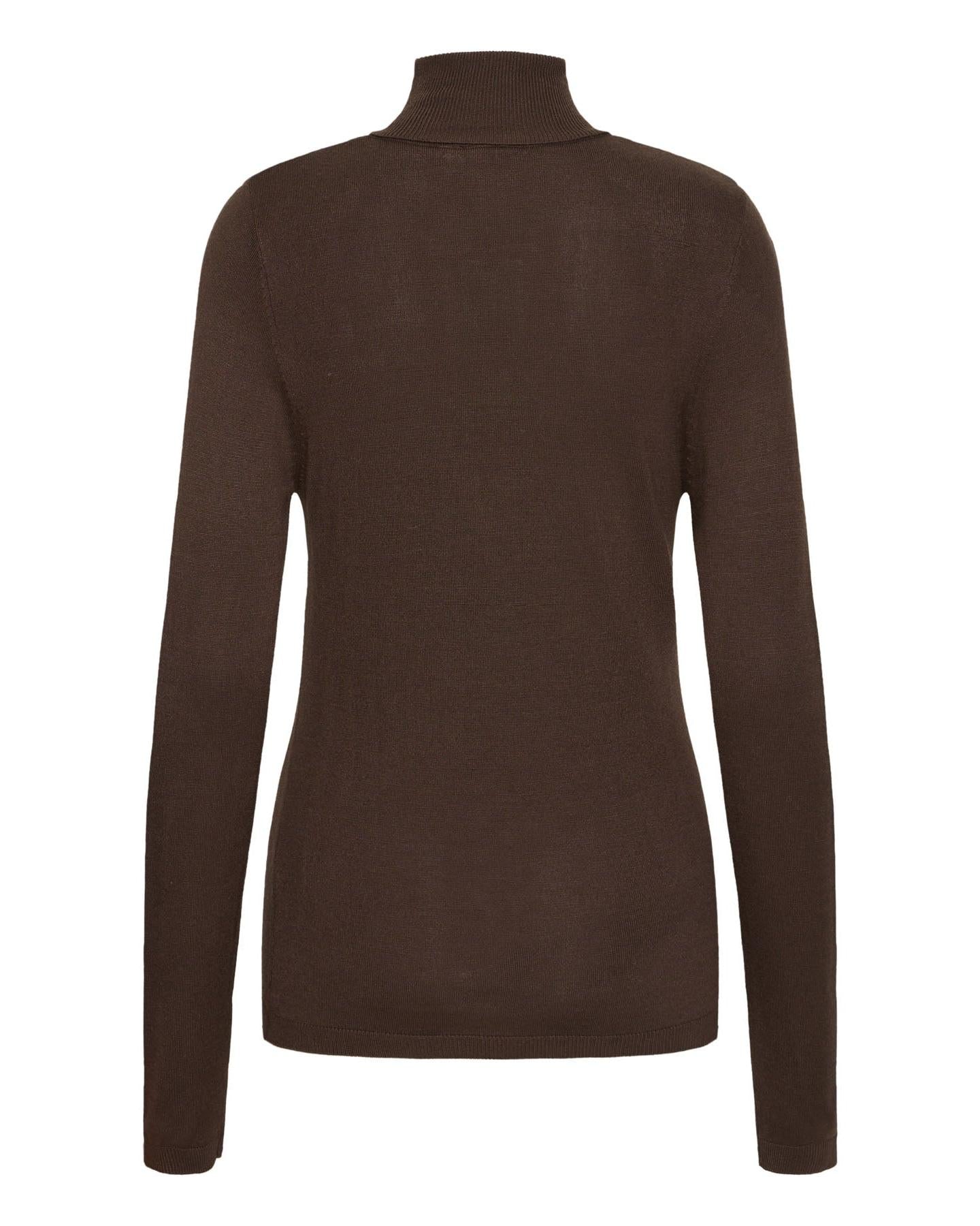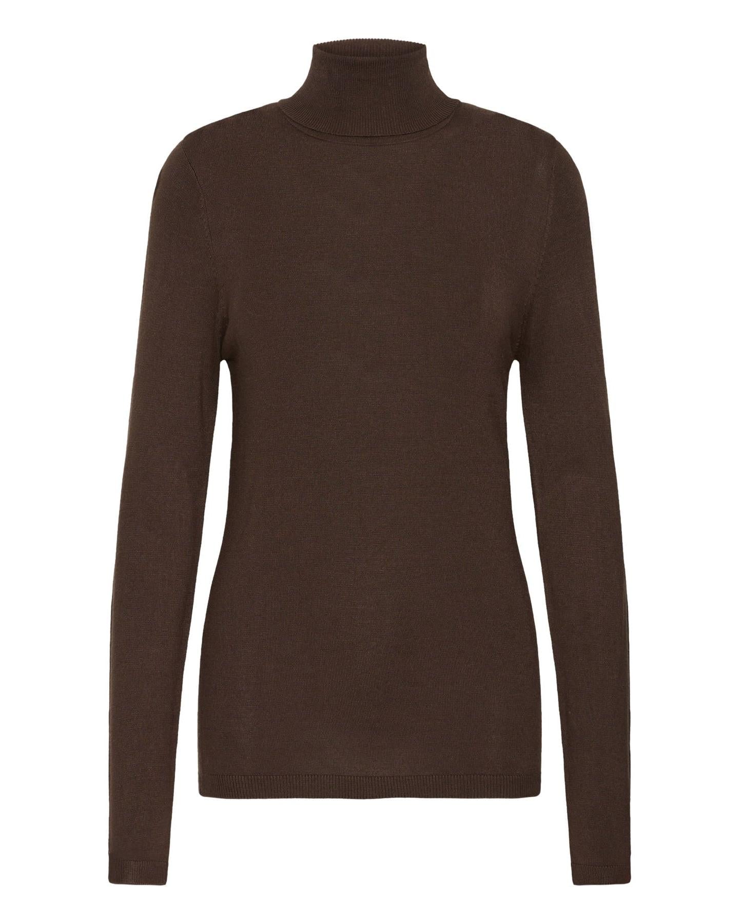 Introducing the Mafa Roll Neck in Coffee Bean from Ichi. A must-have for your wardrobe, this ultra-soft piece is perfect for both dressing up and dressing down. With its slim fit and solid brown colour, it's the perfect layering essential for those cooler autumn days.