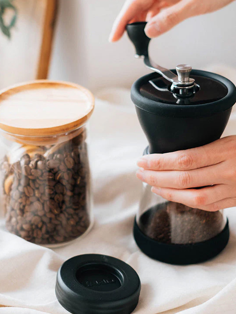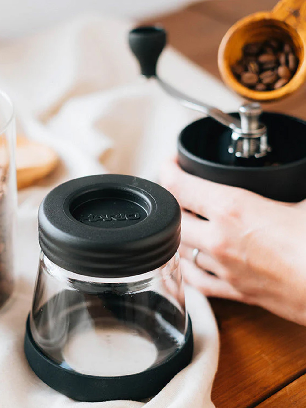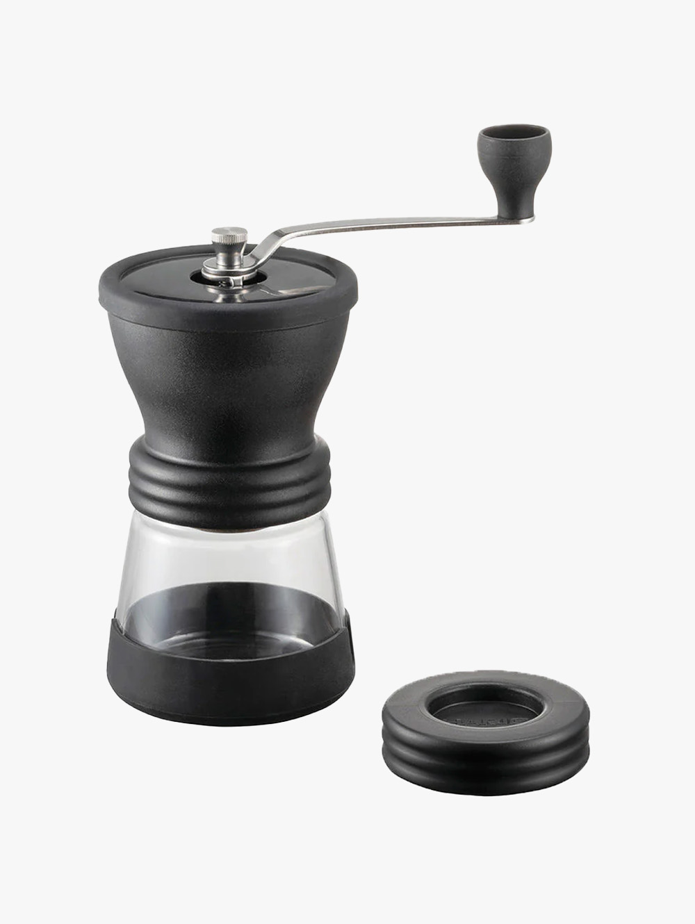 You're looking at the Hario Skerton N Coffee Grinder. This grinder has now recieved an update, featuring a redesigned lower bottle, for improved stability and user-friendliness. Not only does this grinder look great, but its settings are easy to adjust. Its compact size makes it ideal for grinding beans wherever you are. The ceramic burr transfers less heat than steel ones, and provide a consistent grind size, for consistently good brews.