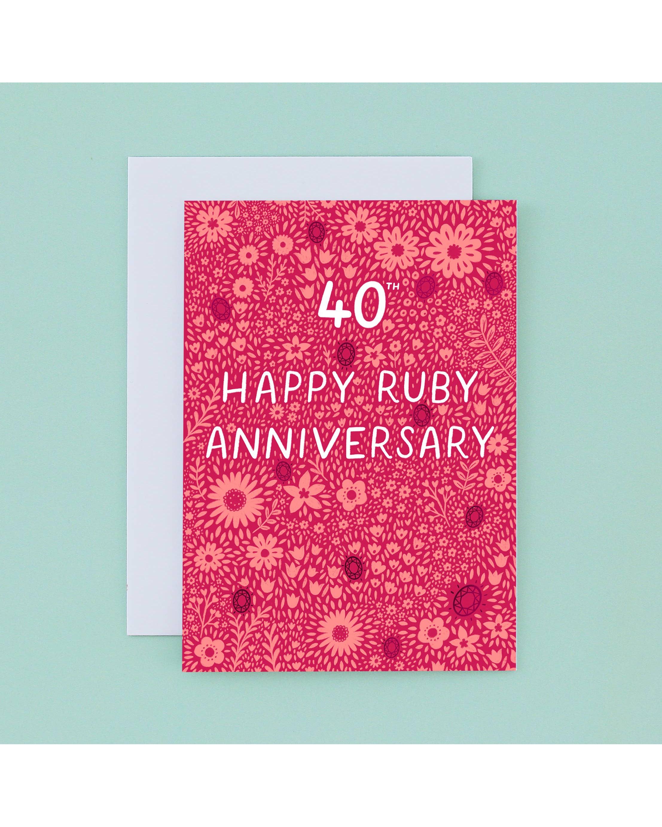 Pretty Anniversary Card - 40th - Ruby. A lovely floral card, complete with little shiny foiled rubies dotted around. OUR CARDS - Size - 120 x 170mm, a standard size, perfect for sitting on shop shelves and in card racks. - Lovely and thick FSC certified 300gsm matt card. - Blank inside and professionally printed for super vivid colours, the finish is really clear and crisp. - Each card comes nested with a white envelope. - All designed by illustrator Emma Randall from her garden studio. PLANET FRIENDLY & PLASTIC FREE We really care about our beautiful planet, and Pear Tree Press is dedicated to making sure that their cards impact the environment as little as possible. - No cello wraps and unnecessary packaging. - Each order is printed and made to order, so there is no waste. - The card we use is all FSC certified, from sustainably managed forests. - Made in the UK. Follow us @peartreepress