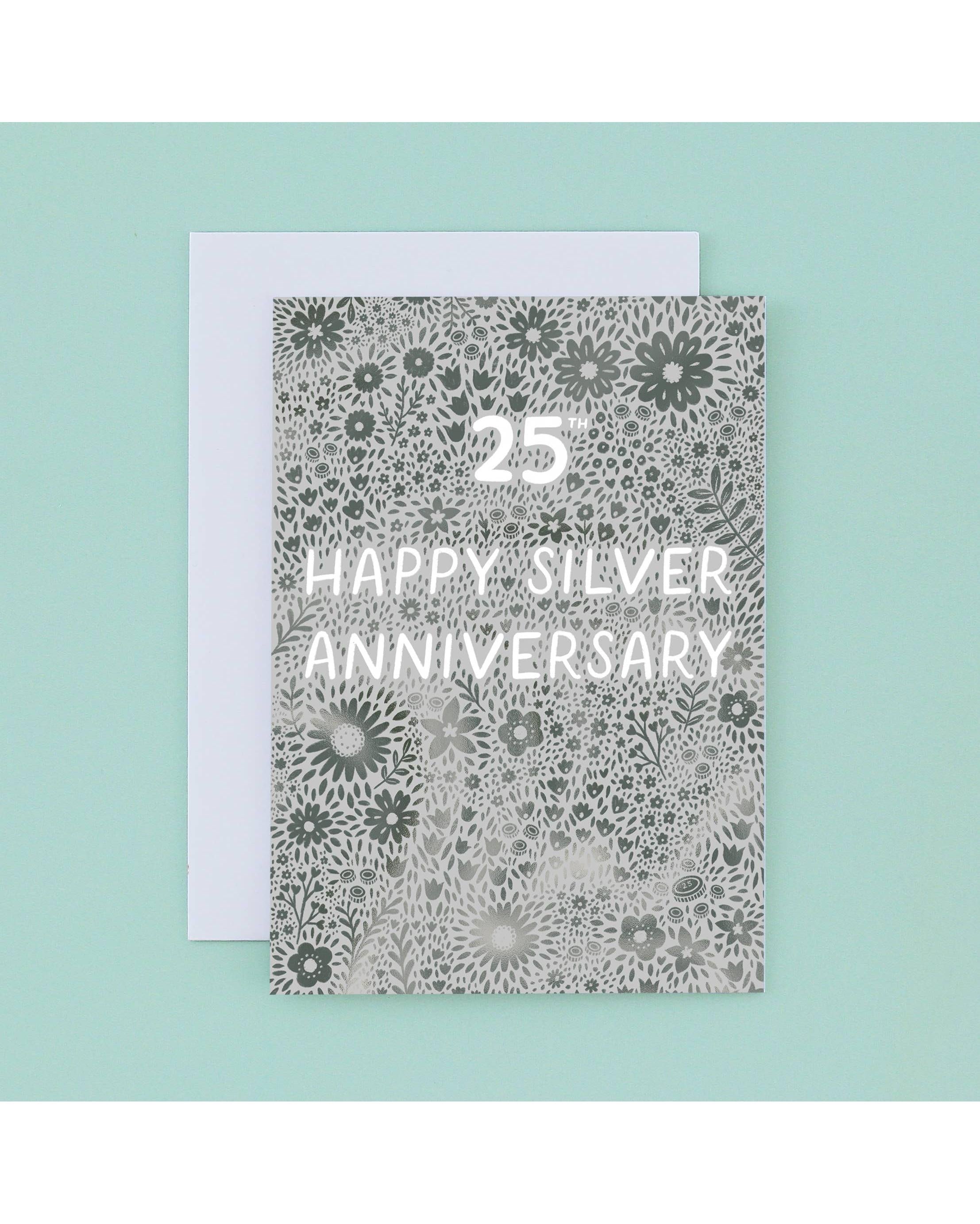 Pretty Anniversary Card - 25th - Silver. A lovely floral card, complete with little silver coins dotted around. The surrounding flowers and coins are all foiled in silver for a lovely effect. OUR CARDS - Size - 120 x 170mm, a standard size, perfect for sitting on shop shelves and in card racks. - Lovely and thick FSC certified 300gsm matt card. - Blank inside and professionally printed for super vivid colours, the finish is really clear and crisp. - Each card comes nested with a white envelope. - All designed by illustrator Emma Randall from her garden studio. PLANET FRIENDLY & PLASTIC FREE We really care about our beautiful planet, and Pear Tree Press is dedicated to making sure that their cards impact the environment as little as possible. - No cello wraps and unnecessary packaging. - Each order is printed and made to order, so there is no waste. - The card we use is all FSC certified, from sustainably managed forests. - Made in the UK. Follow us @peartreepress