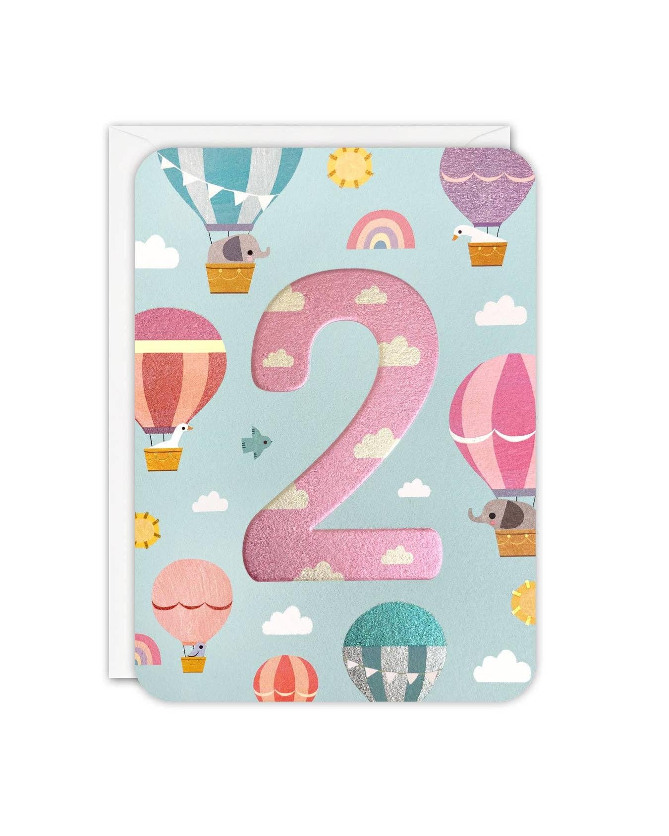 A colourful age two birthday card with rounded corners, illustrated by Linda Tordoff. The image on the front of the card features a large pink '2' surrounded by cute animals in hot air balloons.