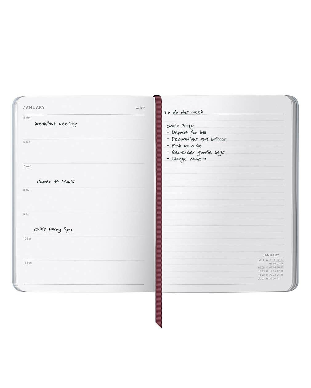 Balance work and home life effortlessly with a clever week to view layout opposite a notes page. Perfect for on the go planning, with ample space to see your week at a glance and record notes or to do lists.