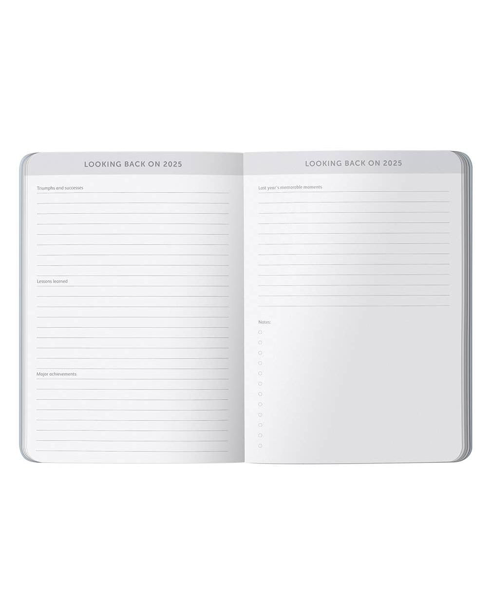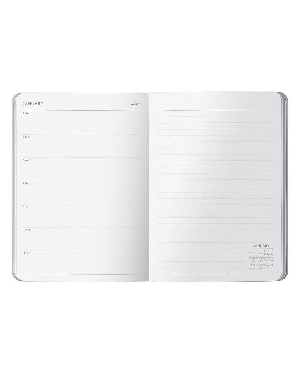 Balance work and home life effortlessly with a clever week to view layout opposite a notes page. Perfect for on the go planning, with ample space to see your week at a glance and record notes or to do lists.