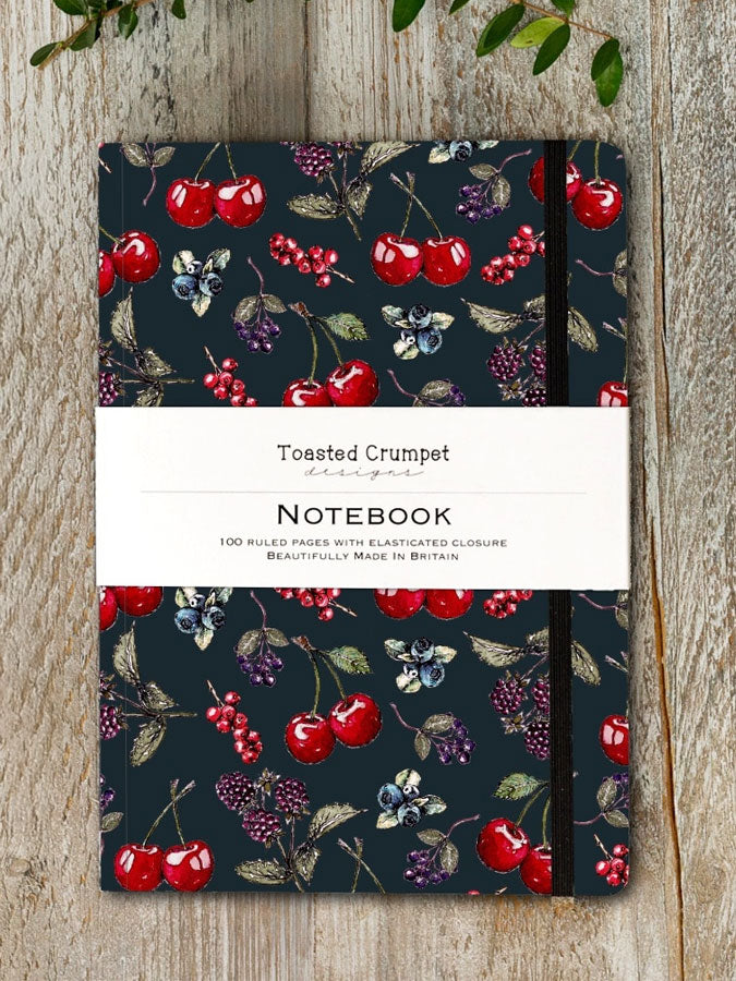Here we have the Mon Cheri A5 Lined Notebook from Toasted Crumpet Designs. A beautifully illustrated cherry notebook featuring 192 lined pages. Complete with an elasticated band to keep all the pages secure, it's the perfect journal to keep in your bag for when you need to jot down those important ideas.