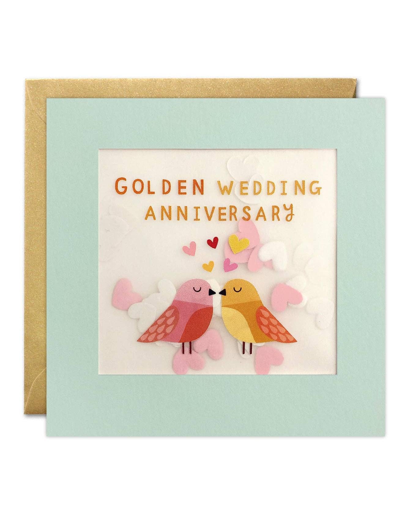 A hand finished golden anniversary card illustrated by Sally Payne. The image on the front features two cute birds facing each other, with little hearts above. The message on the front reads 'Golden Wedding Anniversary'.