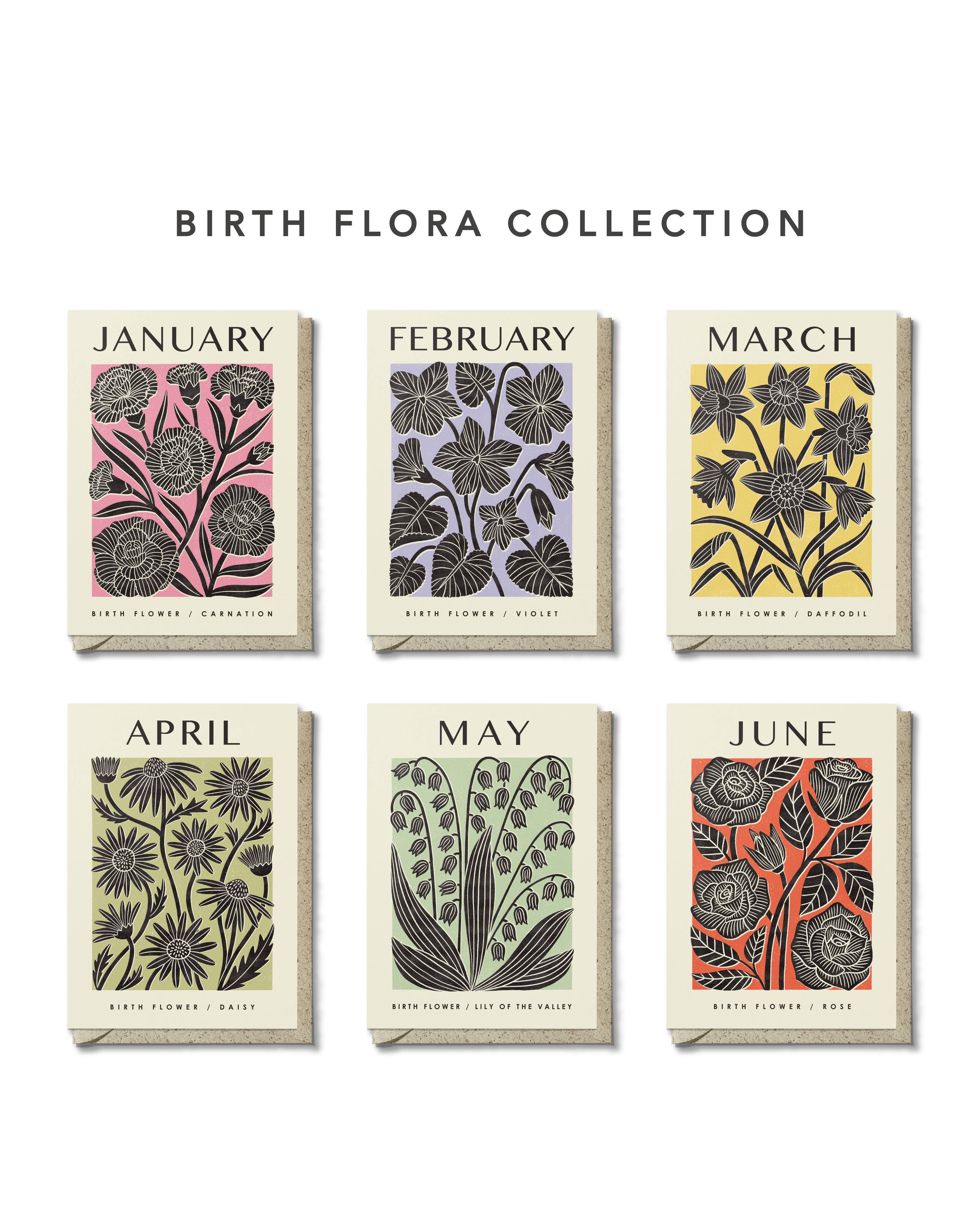 This collection takes inspiration from traditional lino printing and captures each month's flower in a unique and contemporary way. These cards are perfect for celebrating Birthdays and New Babies. Illustrated by Emily Byrd.