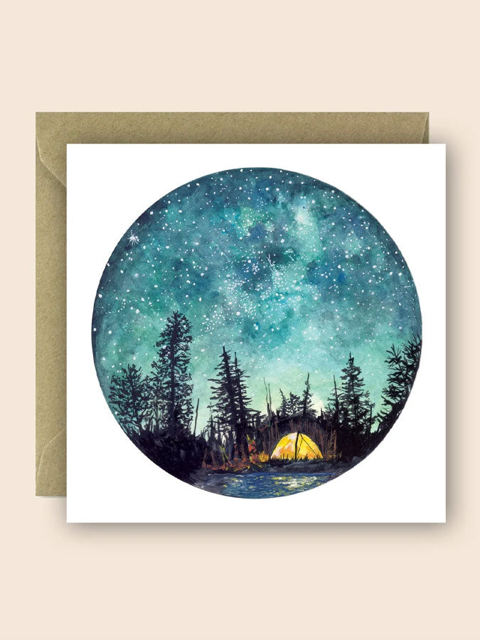Here we have the Camping at Night Greetings Card from Charis Rain Illustration. A vibrant card printed and designed in the UK. Blank inside for your own message, it can be tailored to any occasion. Not only is it a beautiful card, it also makes a lovely print if framed.