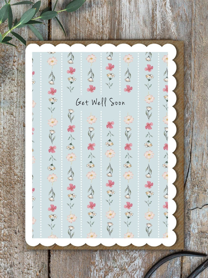 Here we have the Get Well Soon Card from Toasted Crumpet Designs. A beautifully illustrated card, perfect for wishing someone well. Covered in flowers and with get well soon in elegant cursive font, this card is perfect for anyone. Blank inside for your own personal message.