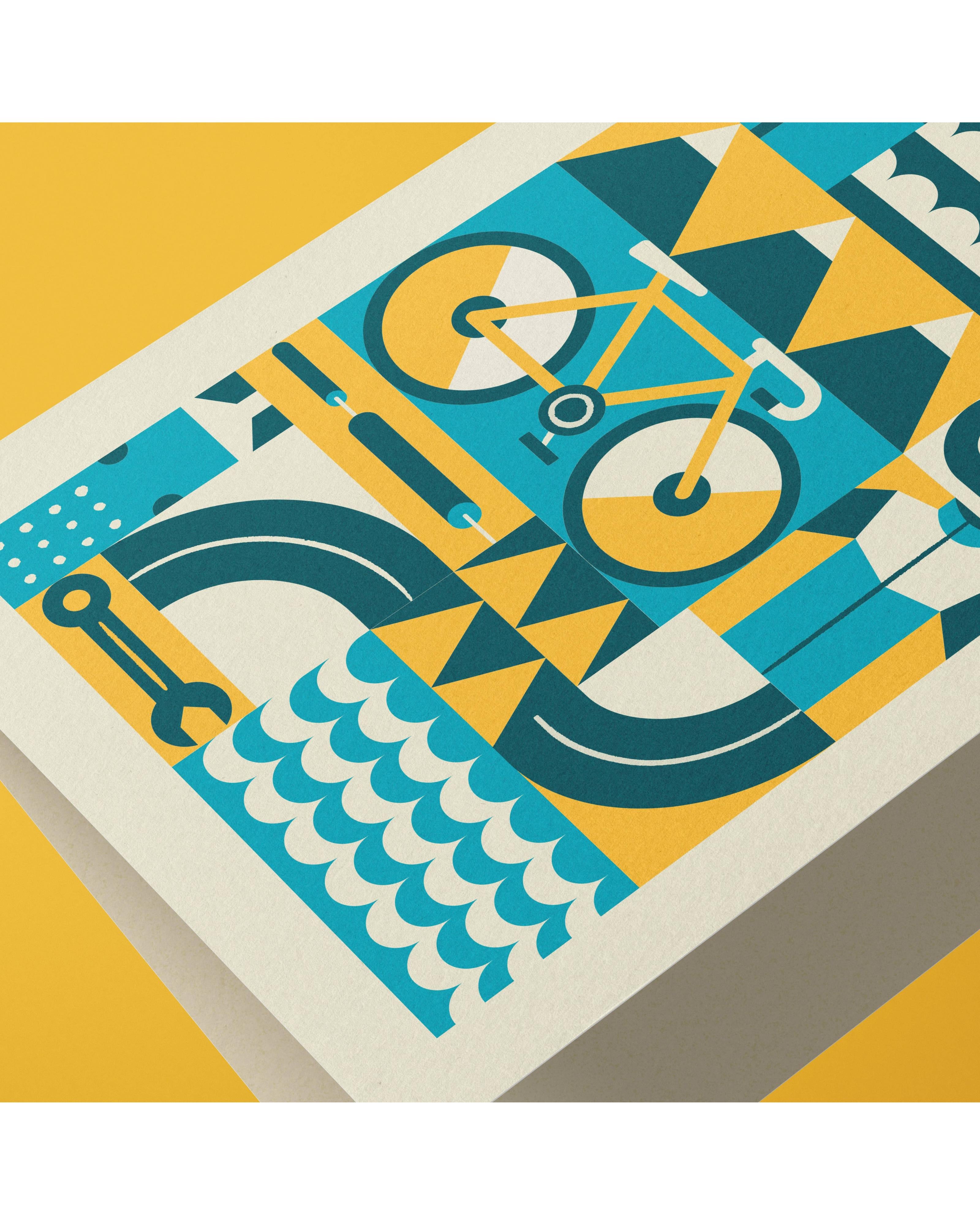 Pedal into fun with the Cycling Sport Retro Geometric Reusable Greeting Card! Featuring Emily Byrd’s bold, modern-retro illustration, this eco-friendly card celebrates the joy of cycling and outdoor adventures. Perfect for gifting, framing, or sending to fellow cycling fans.