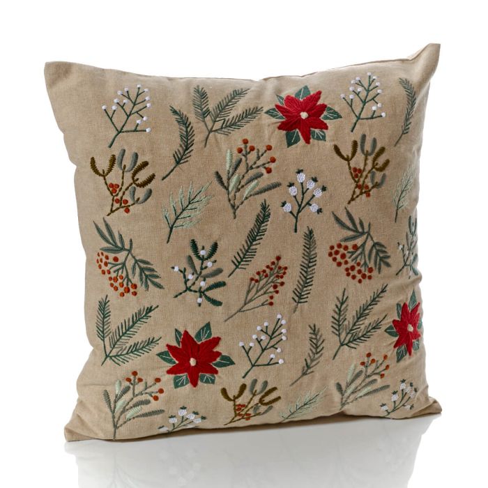Add a burst of festive cheer to your sofa with this cosy cotton cushion, sprinkled with embroidered poinsettias, berries, and greenery. Its bright stitching pops beautifully against the soft beige fabric—perfect for giving your space a merry little makeover!