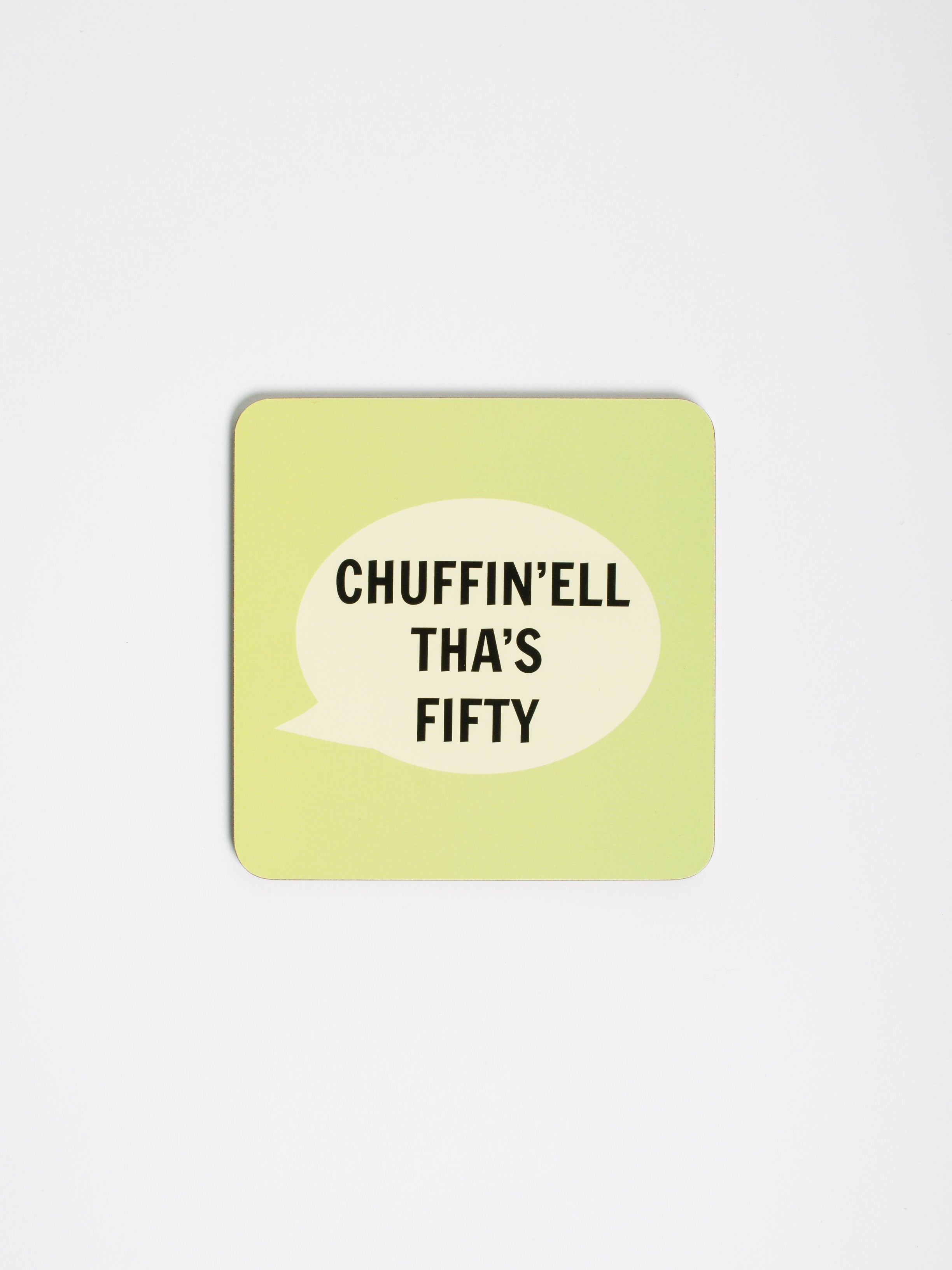 Introducing the Chuffin'ell Tha's Fifty Coaster from Dialectable! This vibrant coaster features the saying 'Chuffin'ell Tha's Fifty' and makes for a great present for someone hitting the milestone of 50 years!