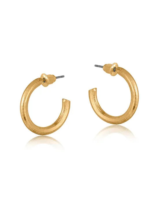 Add a little shine with the Anthonia Halo Small Hoop Earrings by Big Metal. Featuring a high-shine plated finish with subtle textured detailing, these handcrafted hoops bring a modern statement to everyday looks. Made with recycled brass and finished with sterling silver posts.