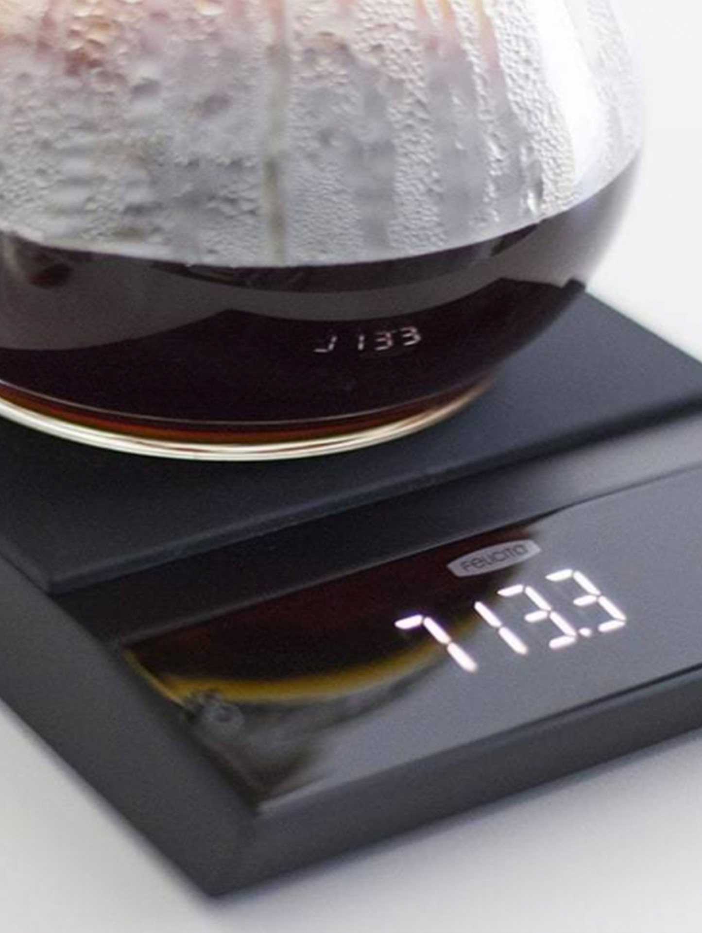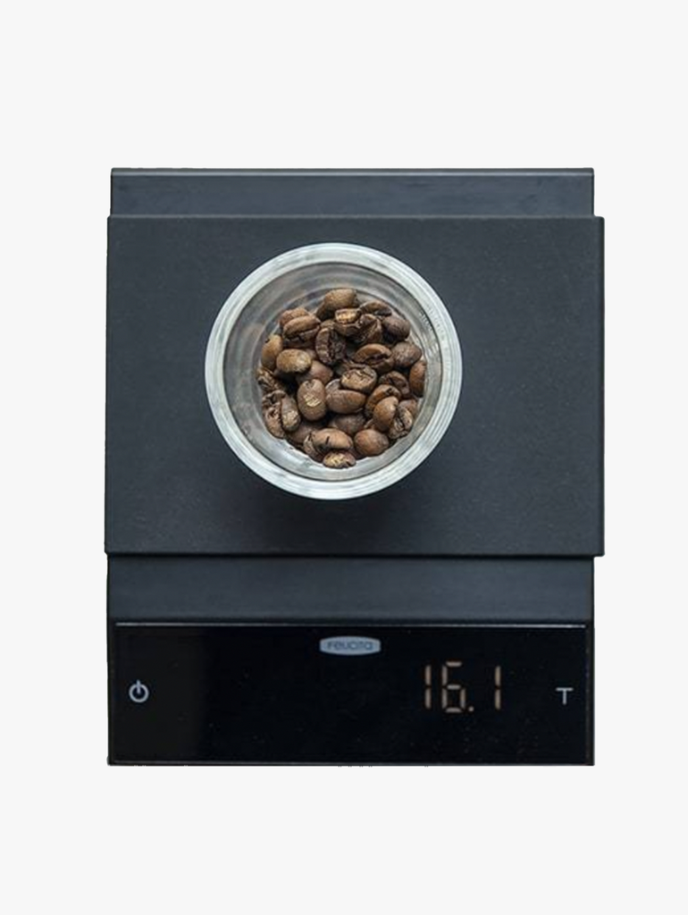 You're looking at the the Felicita Incline Coffee Scale. Designed for high-volume bar service, these scales can double as both espresso and pour over coffee scale. Its compact size allows it to fit comfortably on an espresso machine drip tray, or on the brew bar. Measuring both weight (g/oz) and time concurrently via a joint LCD display, the Felicita Incline Coffee Scale's incredible sensitivity and responsiveness make for a cohesive and intuitive barista experience. The Felicita Incline Coffee Scale is lithium-ion rechargeable via USB and bluetooth-connective and can take up to 2kg of weight. And to top that all off, it’s inherently water-resistant and can be likewise equipped with a heat-resistant rubber mat. A perfect coffee companion for working with on the bar.