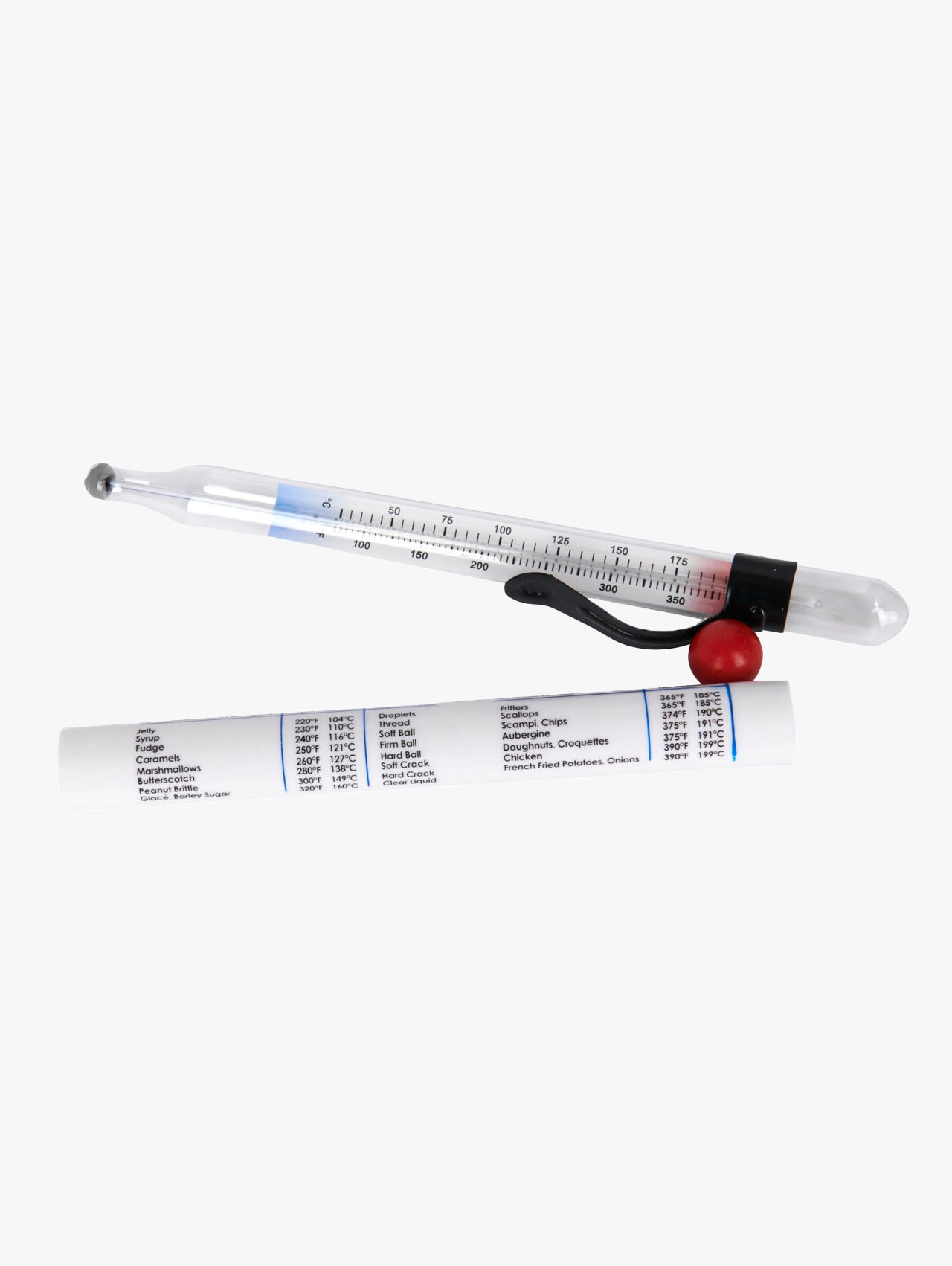 You're looking at the Chefs Thermometer from Kitchen Craft. Temperature is everything when you’re making jams and confectionary, or deep frying your food. So, whether you’re bringing jam to a rolling boil, deep frying chicken or making pear drops, with KitchenCraft’s Glass Jam / Sugar Thermometer you can get rid of the guesswork. This high-quality thermometer can measure temperatures between 25 and 205 degrees Celsius, so it’s useful for a whole range of precision cooking tasks – from making sweets to frying chips.