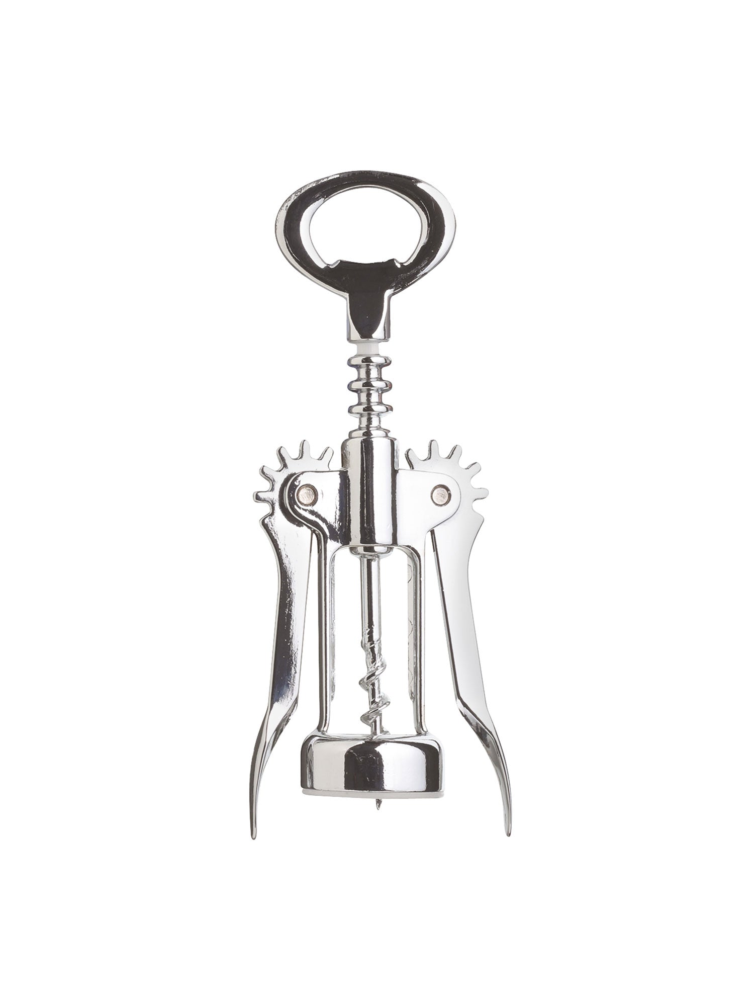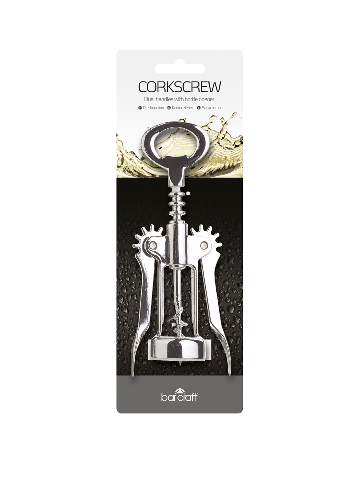 Here is a BarCraft Double Handled Chrome Wing Corkscrew from Kitchen Craft. A classic double handled wing corkscrew with a mirror polished finish and a dual purpose top handle that conveniently also opens crown top bottles.