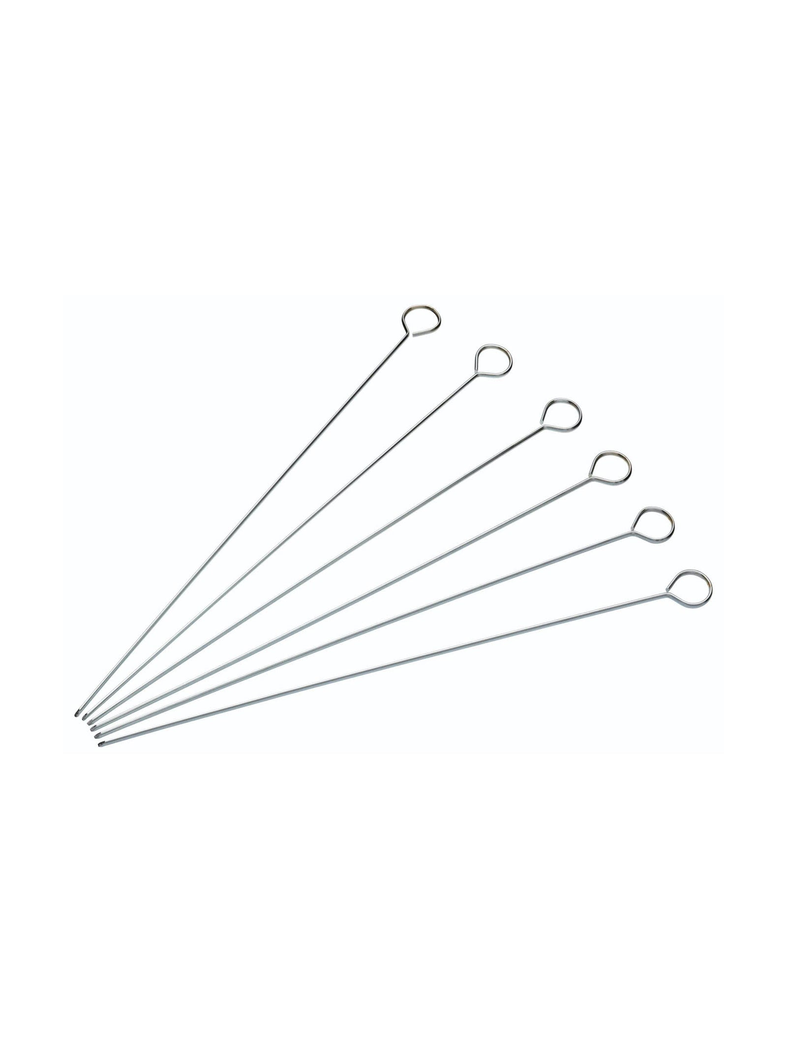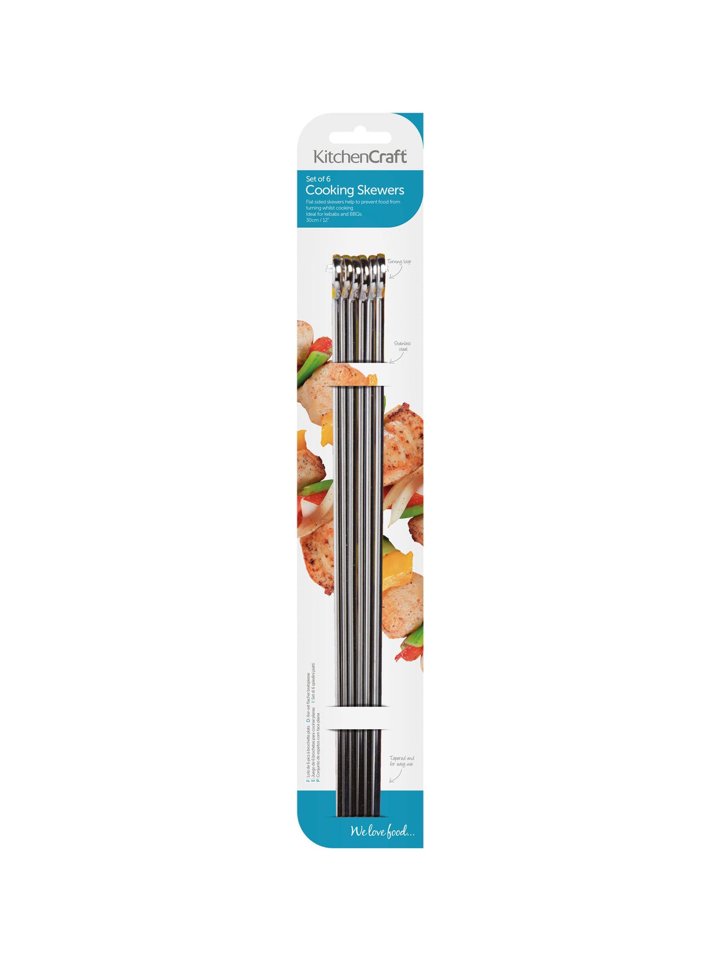 We have here a pack of six Cooking Skewers 30cm from Kitchen Craft. Six large, reusable metal cooking skewers ideal for cooking a variety of different types of kebabs and party food. Features a flat side to prevent food from turning whilst cooking and a lifting ring at the end for easy handling.