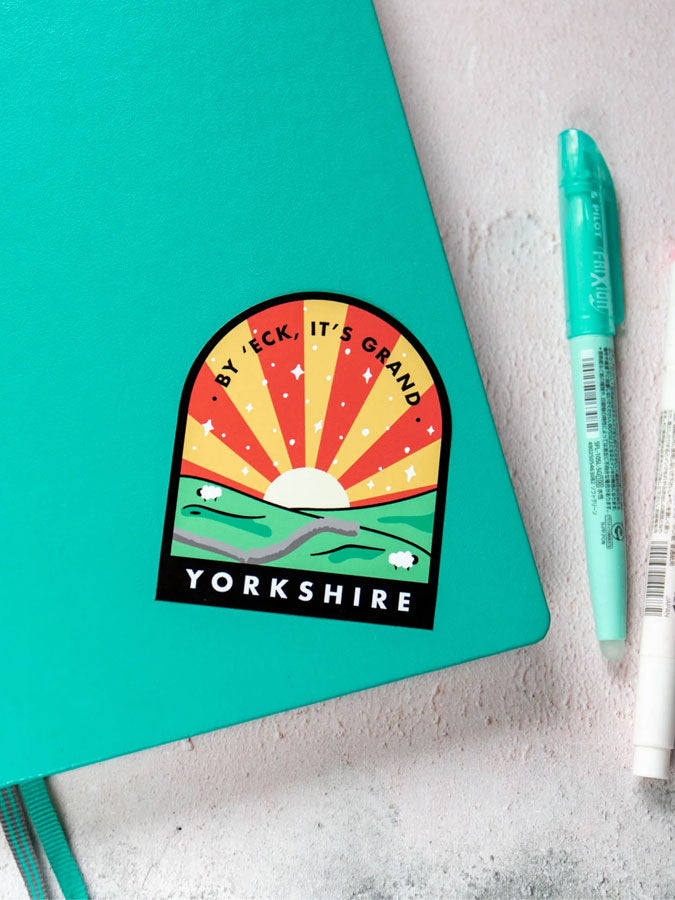 Here we have the By ‘Eck It’s Grand Yorkshire Vinyl Sticker from Finest Imaginary. Adorn your favourite planner, notebook, laptop, lunch box or best friend with these large, colourful vinyl stickers! By 'Eck It's Grand, our little tribute to God's Own County, Yorkshire! This sticker is vibrantly printed using UV stable ink onto a heavy duty vinyl with strong adhesive backing and measures approximately 6.5cm x 8cm. The price is for a single sticker.