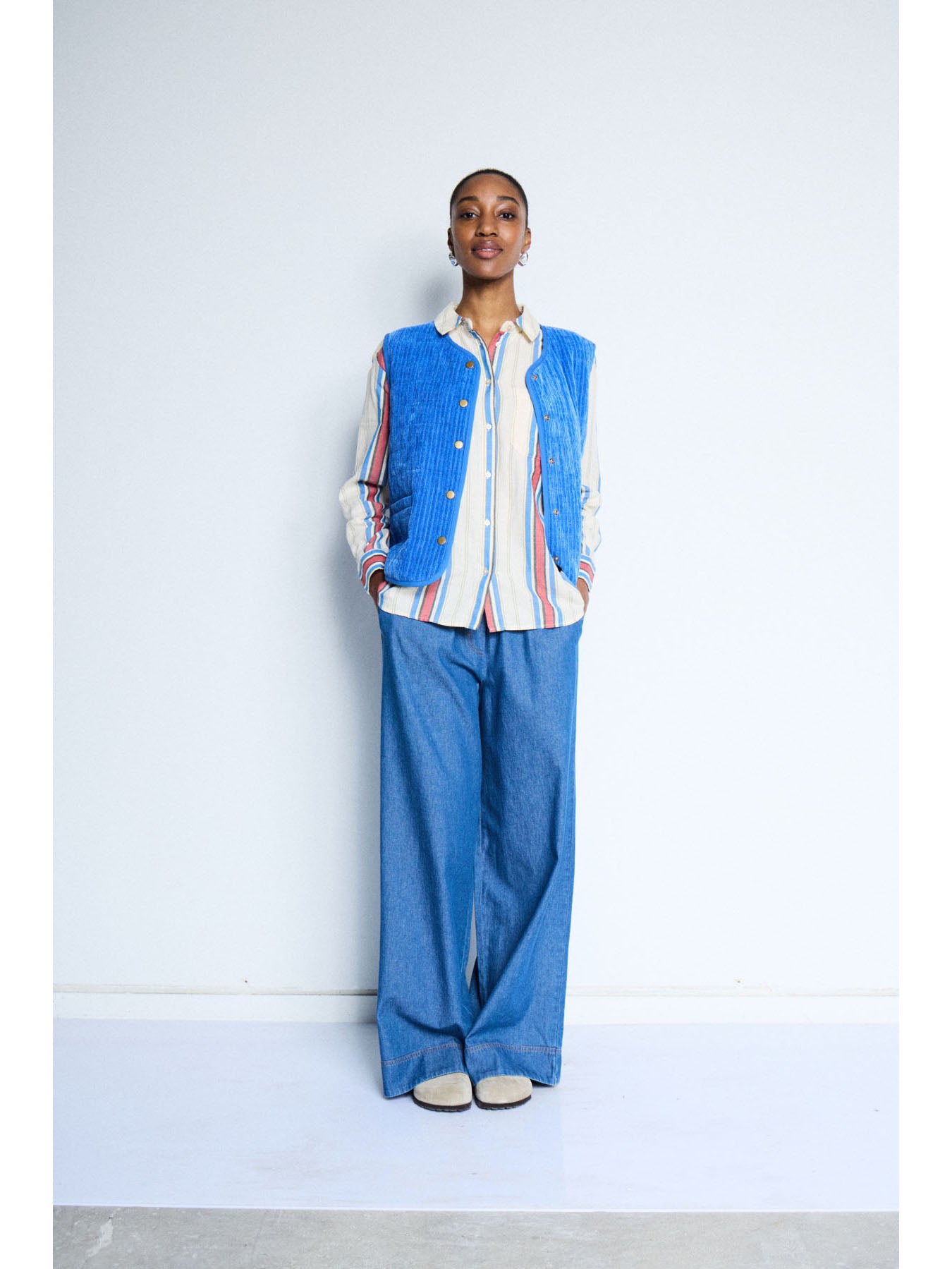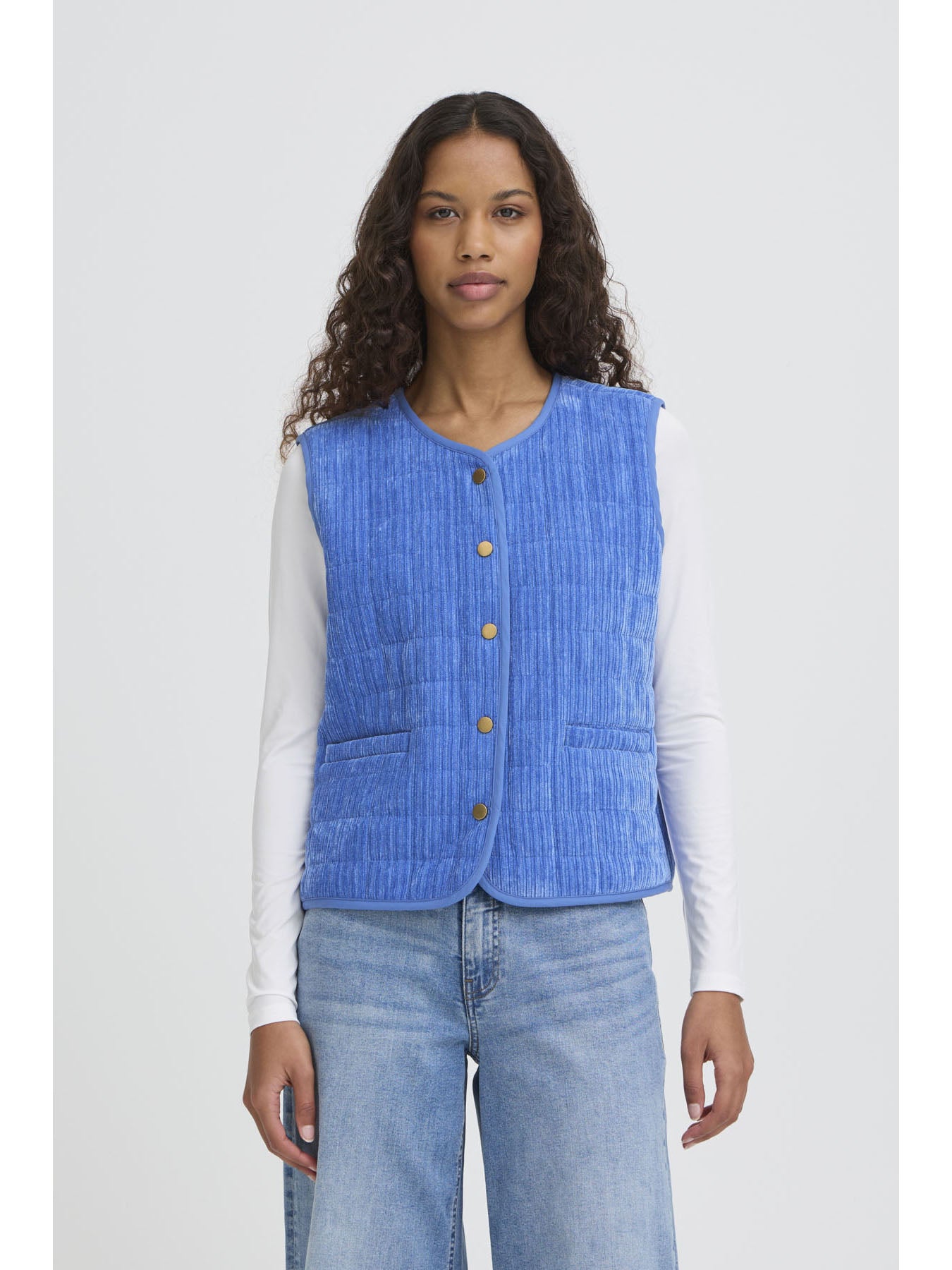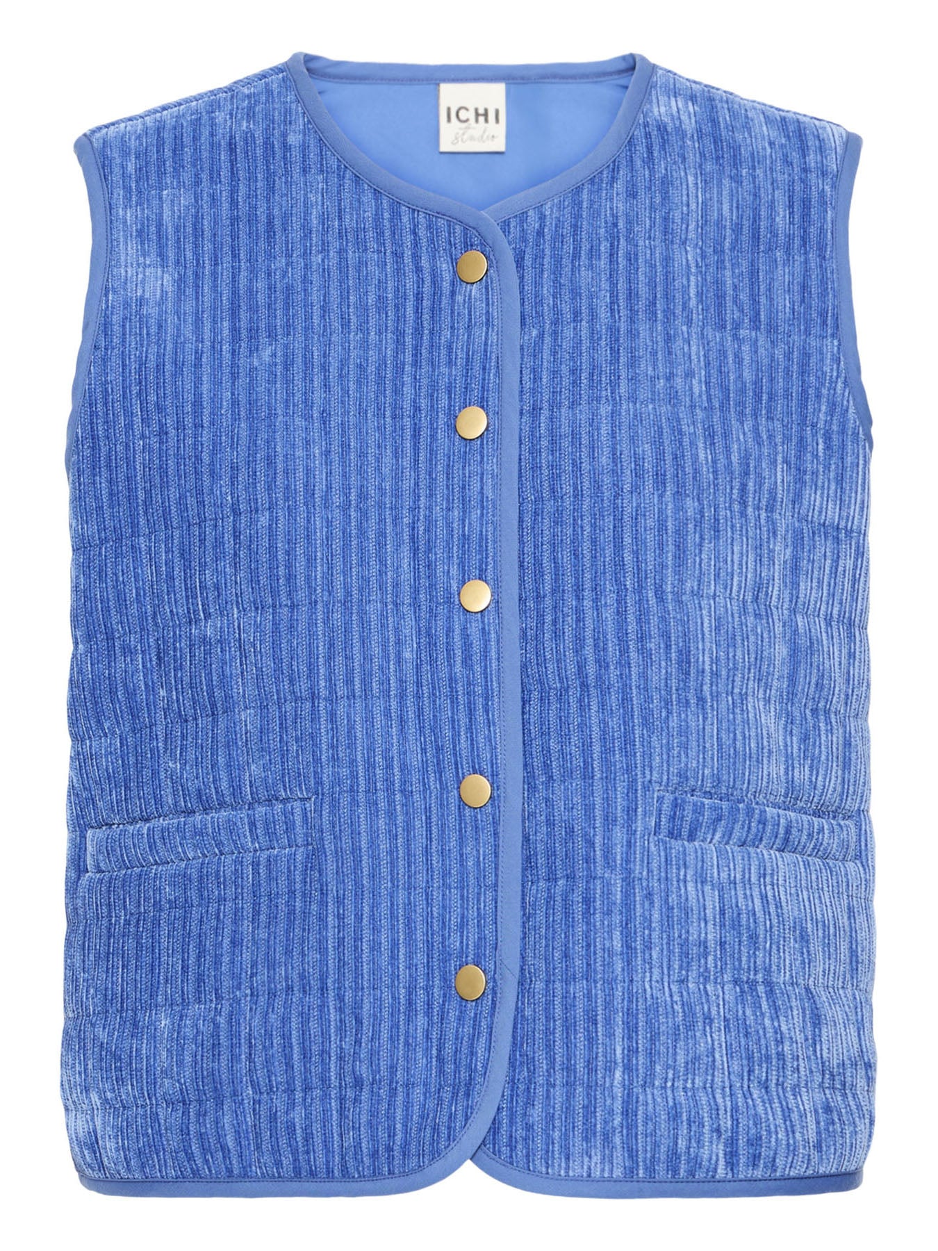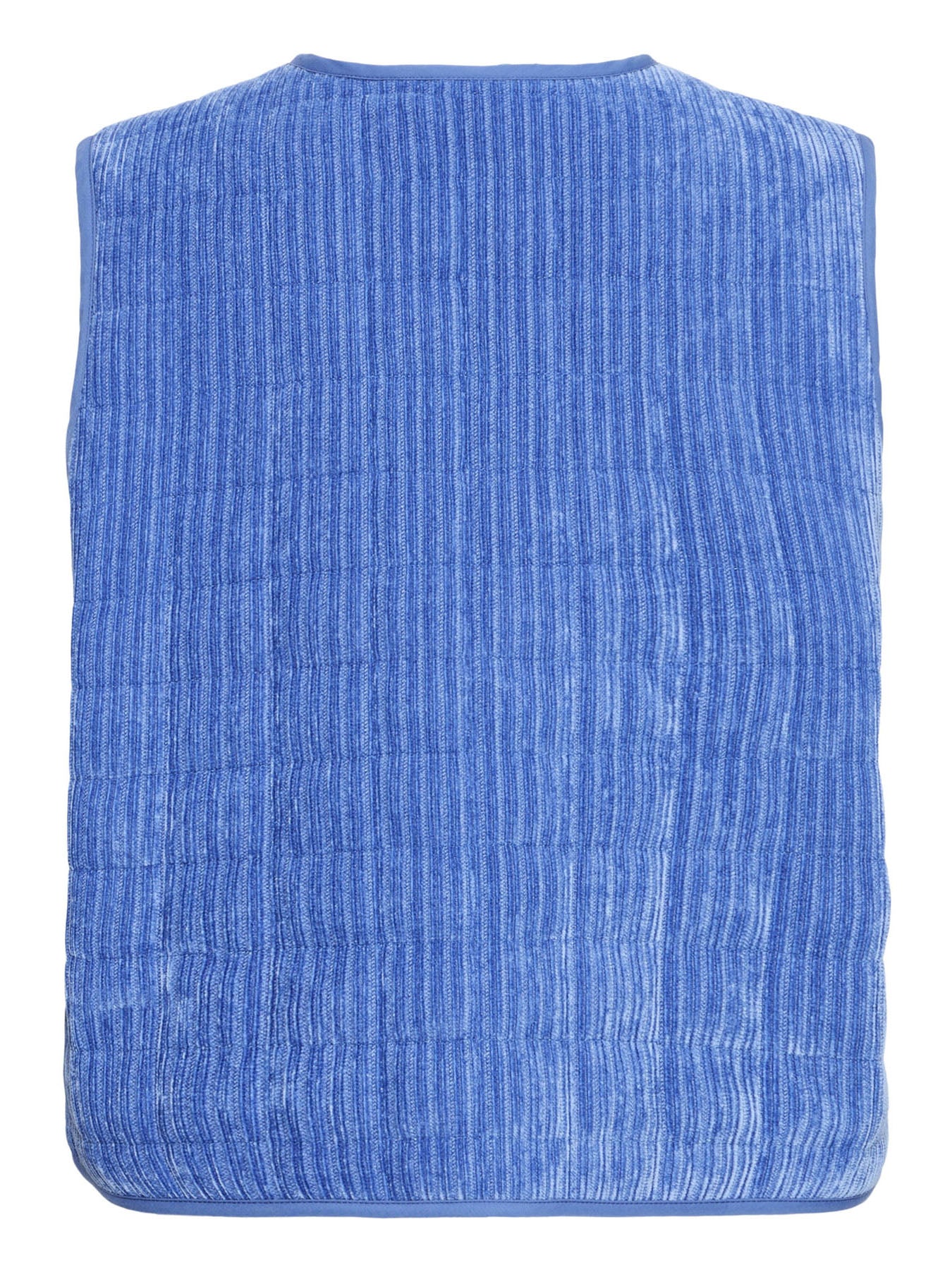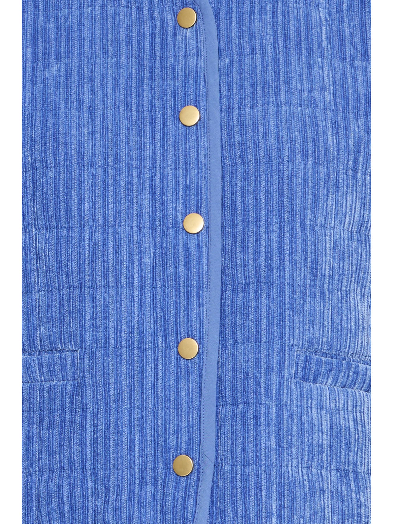 A blue sleeveless waistcoat with snap buttons down the front, crafted from a soft, lightweight cord fabric — perfect for adding an extra layer and a pop of colour to your look.