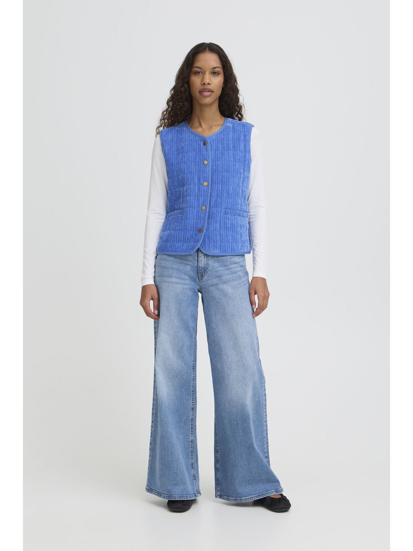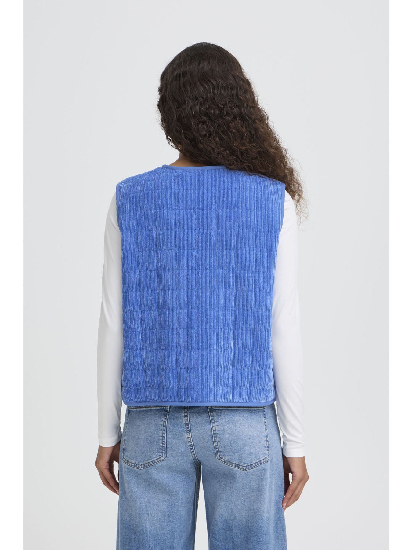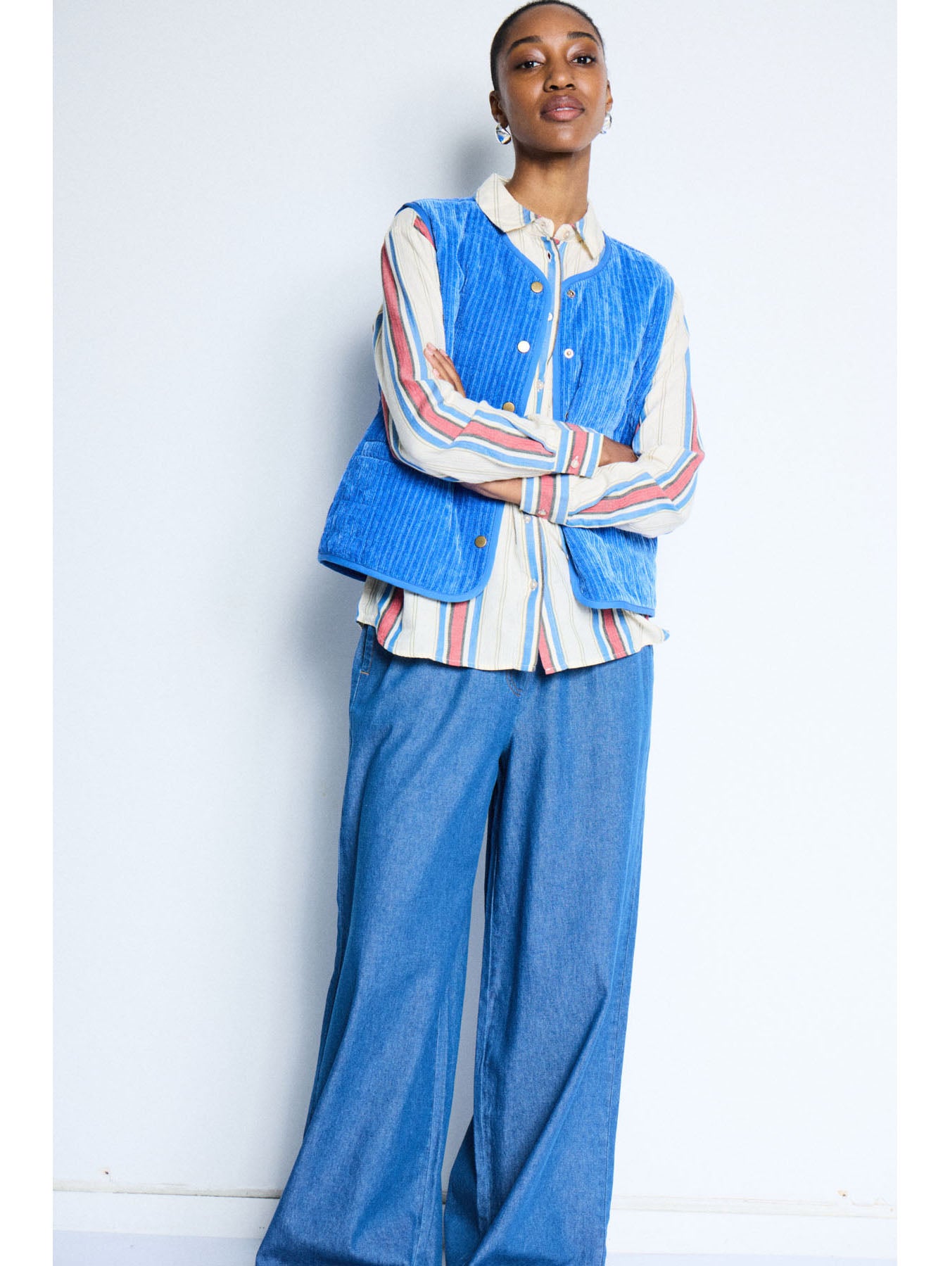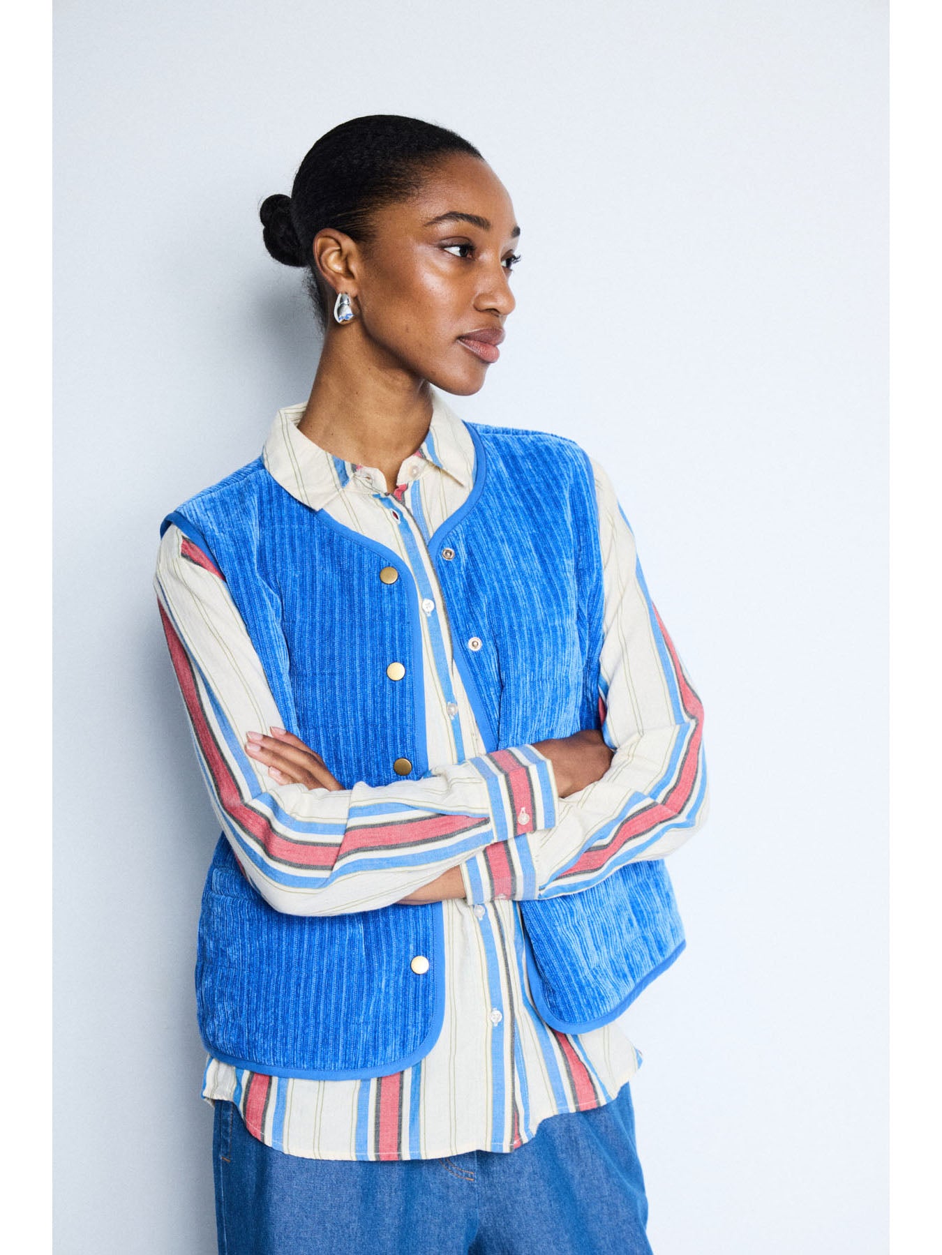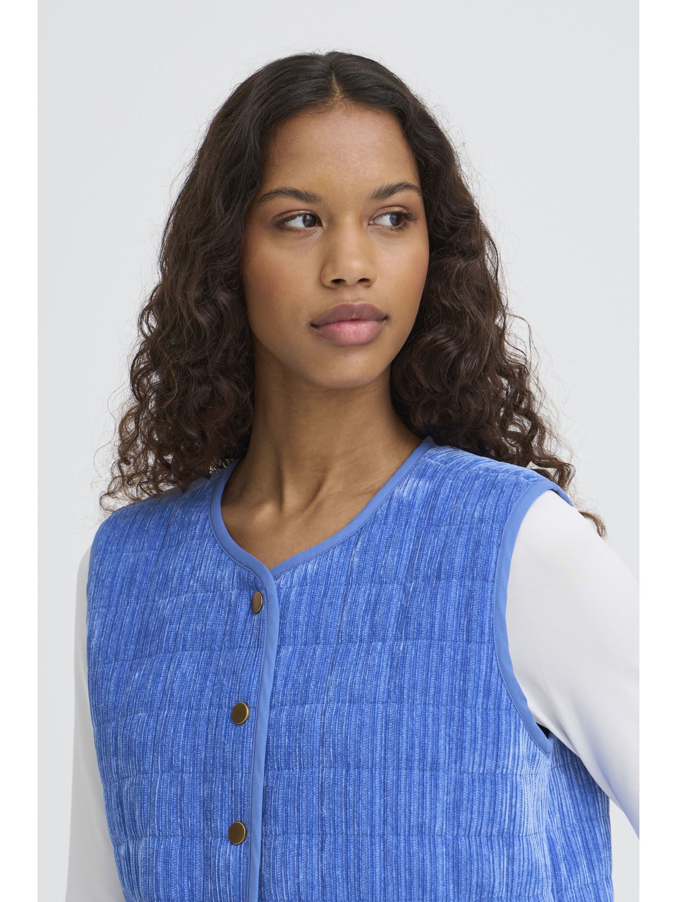A blue sleeveless waistcoat with snap buttons down the front, crafted from a soft, lightweight cord fabric — perfect for adding an extra layer and a pop of colour to your look.