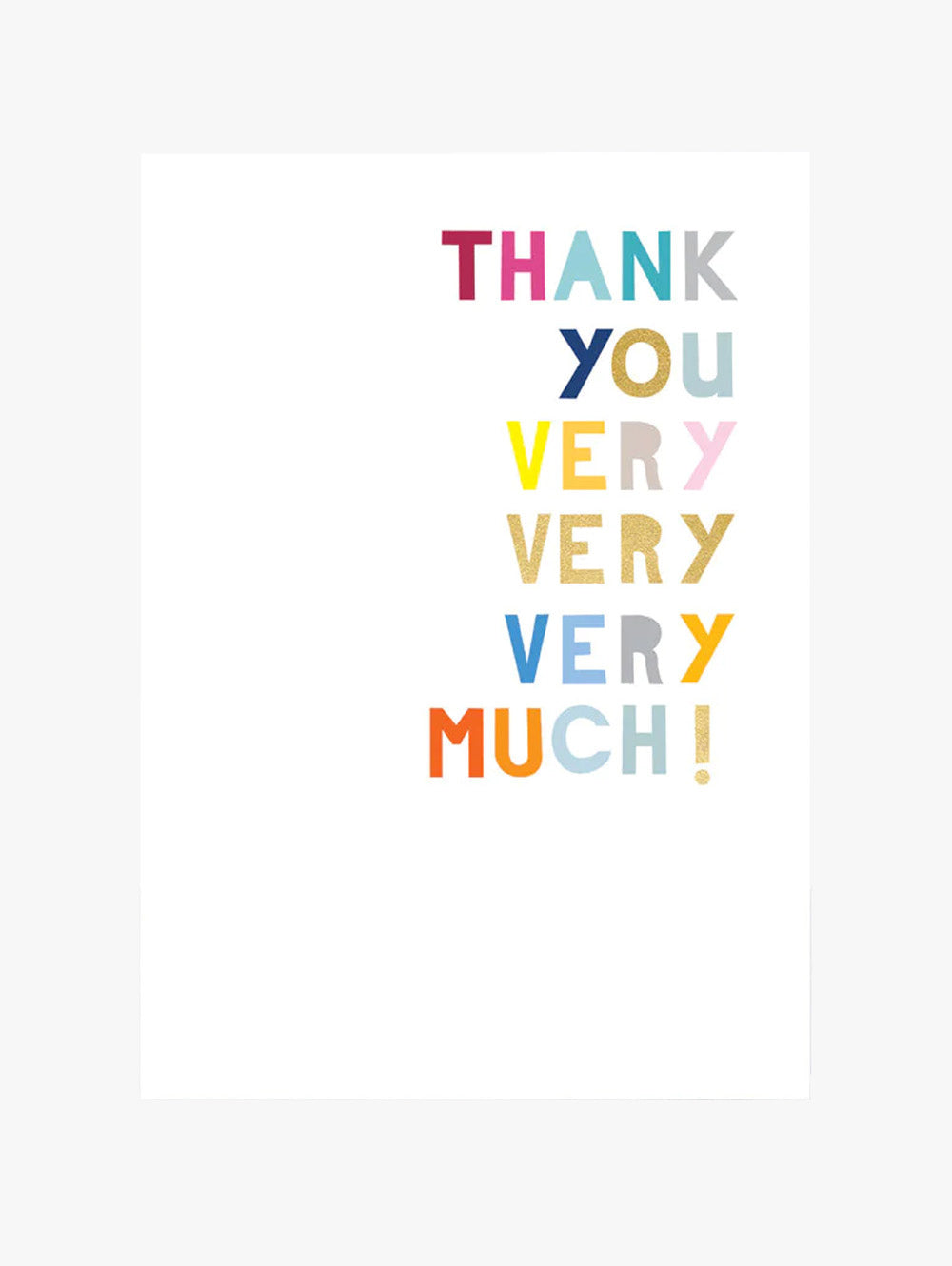 You're looking at the Thank You Very Much Card from Rachel Ellen. A colourful thank you card with a simple, sophisticated palette of vibrant colours. This striking card is printed on textured board and finished with pops of gold foil. Supplied with a bespoke blue envelope.