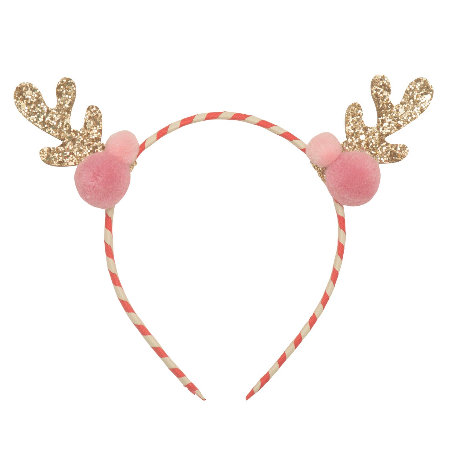 Bring a touch of Christmas sparkle with the jolliest headband of the season! Featuring chunky gold glitter reindeer ears topped with bright pink pom poms, this festive favourite sits on a red and cream striped fabric-covered band for a comfy fit. Made using recycled glitter and ribbon — perfect for festive parties and Christmas fun!