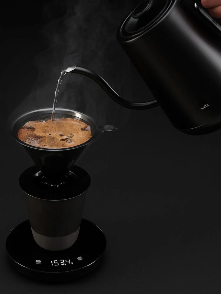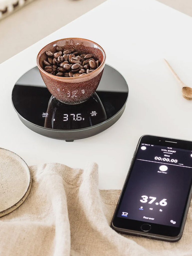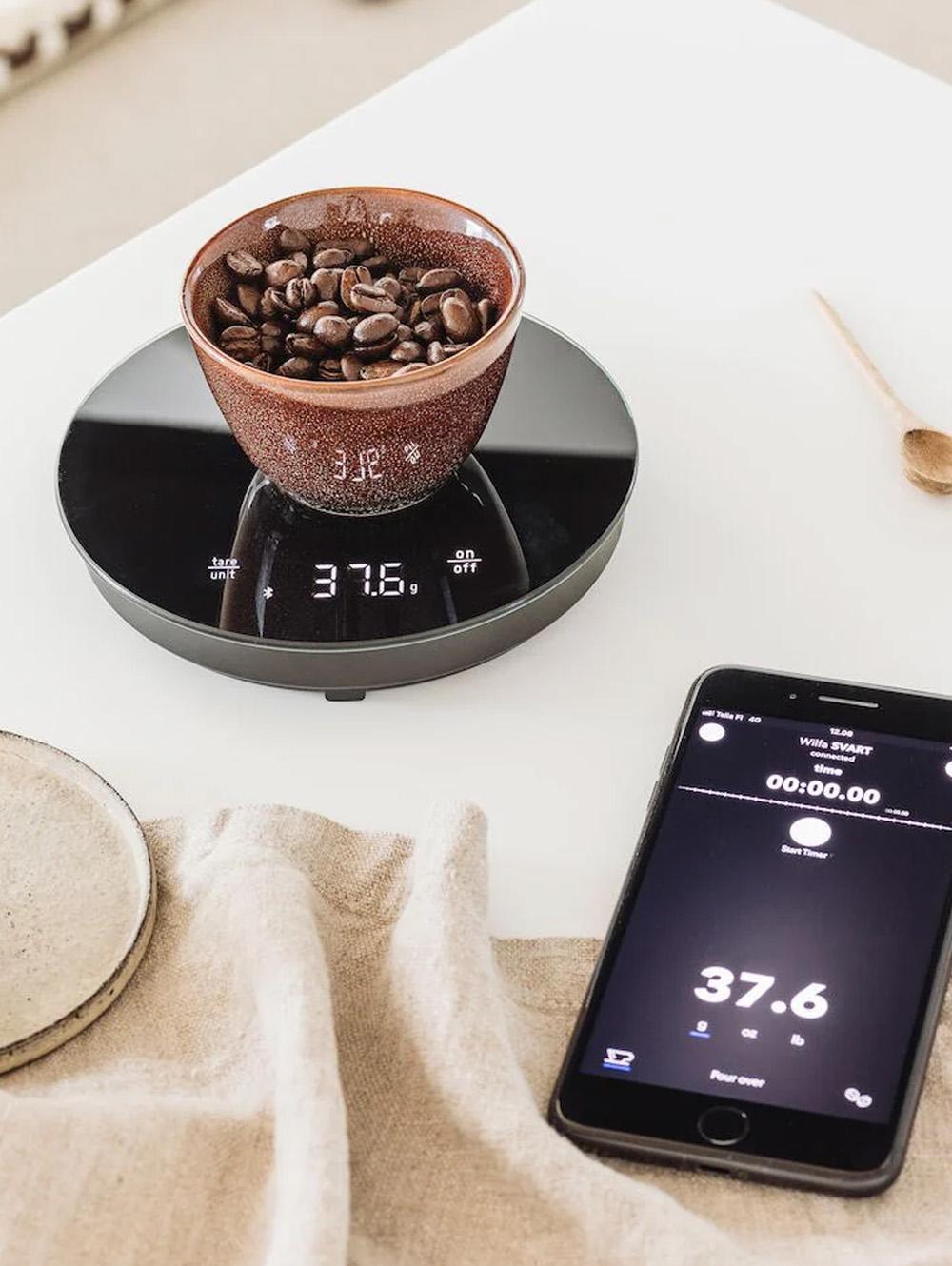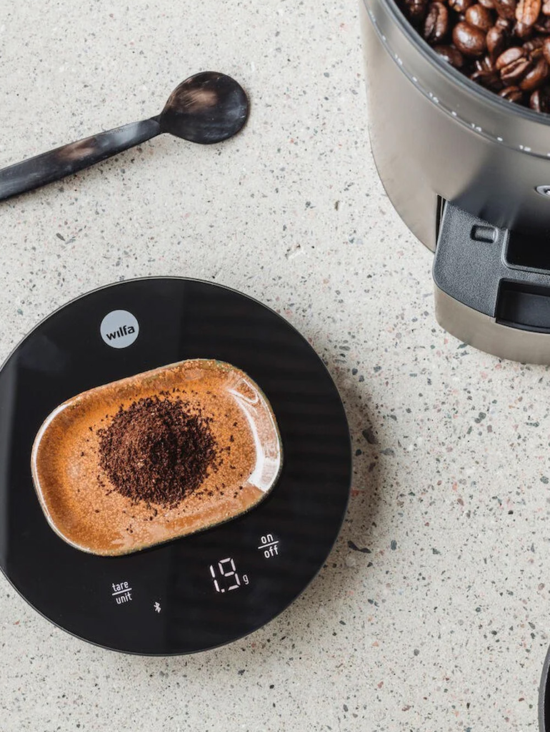 This is the Wilfa Uniform Scales & Kitchen Scale. Reliable and accurate just what you need when you're cooking up a storm in the kitchen! The digital kitchen scale is an updated version with improved rechargeable battery with USB-C charging, timer function and new accessories. Wilfa Uniform Scales have a high capacity, up to 2kg and offer responsiveness and accuracy down to 0.1g so you can measure your ingredients with precision. The LED display is easy to read at a glance and the scales can even connect via Bluetooth to our useful app. A good brewing scale is important if you want to make really good coffee at home and the Uniform & Kitchen precision scale has a practical timer function that helps you keep track of the time while brewing coffee. It ensures that you make the perfect pour-over coffee every time. A sudden increase in temperature can affect the accuracy of the scale. We therefore recommend using the supplied silicone pad on the scale when you are brewing coffee on the scale or measuring hot liquid. The scale communicates with iOS devices and Android devices via a blue-tooth. For coffee lovers; The Wilfa BLACK app shows you the perfect blend of coffee and water to the very last drop.
